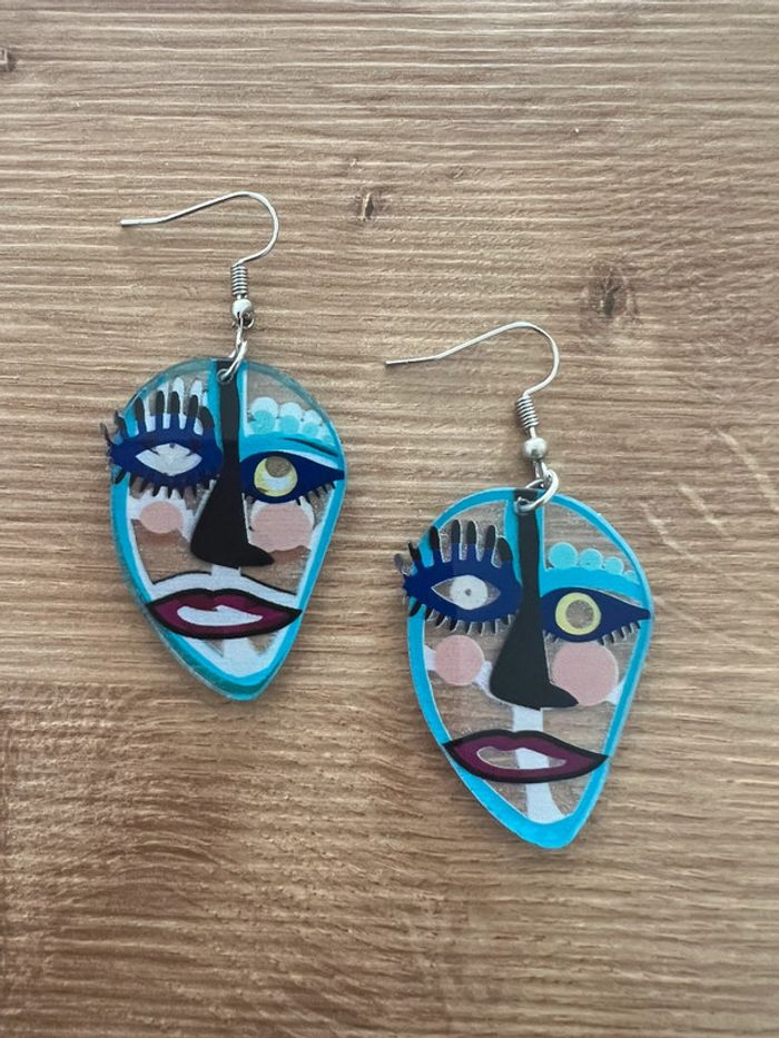 Boucles d’oreilles têtes bleues originales Hauteur de la boucle environ 6 cm