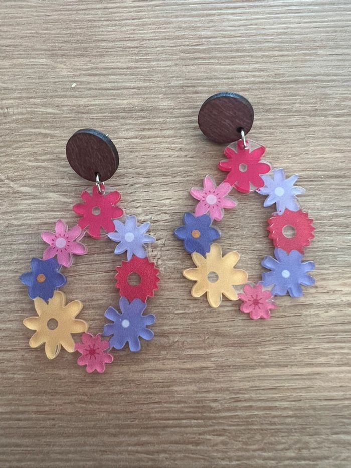 Boucles d’oreilles couronnes fleurs multicolores Hauteur de la boucle environ 6 cm