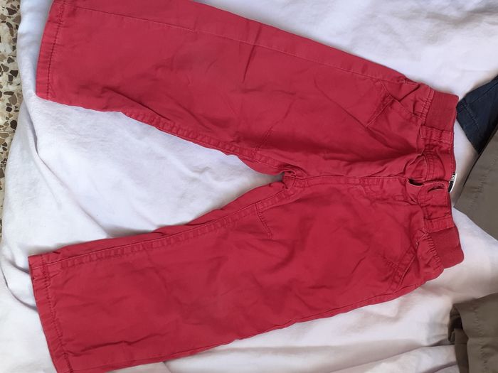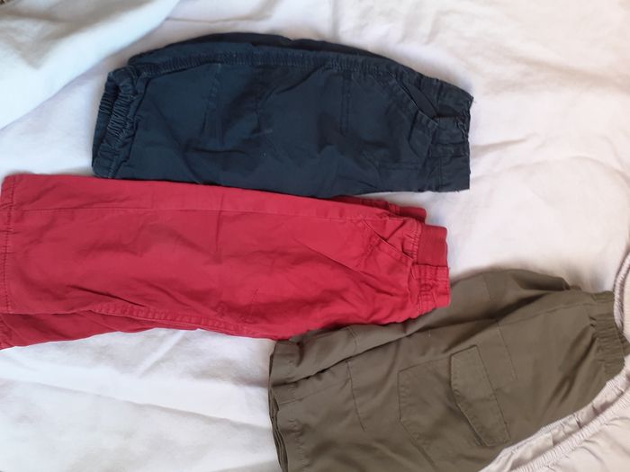 Bonjour je vends 3 pantalon en taille 6 moi s 1 kaki 1 bleu marine marque kitchour et 1 rouge marque tape à l œil je fait le lots 2 euro