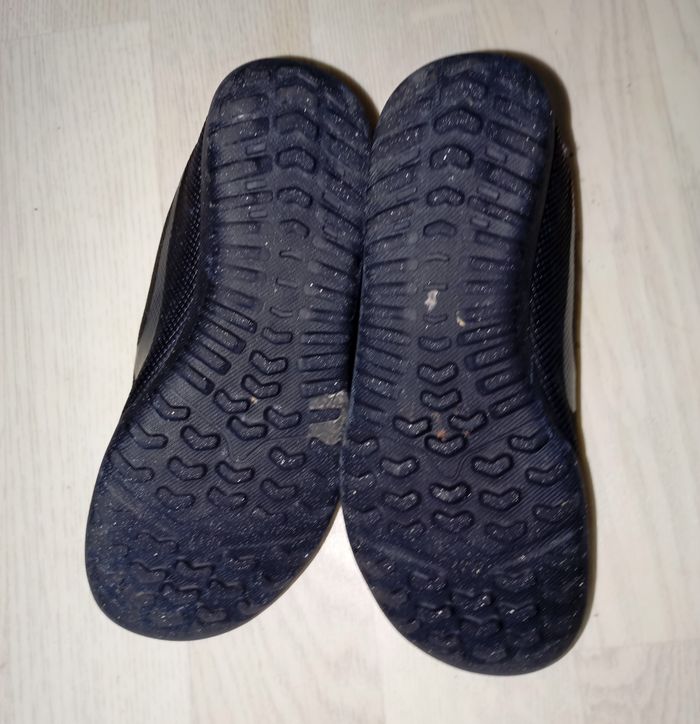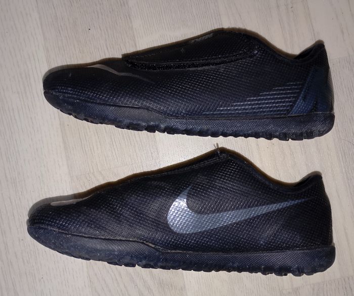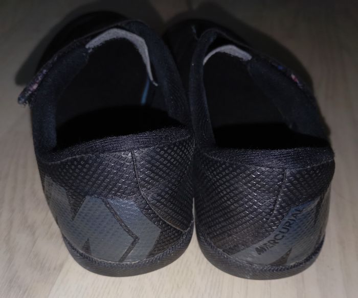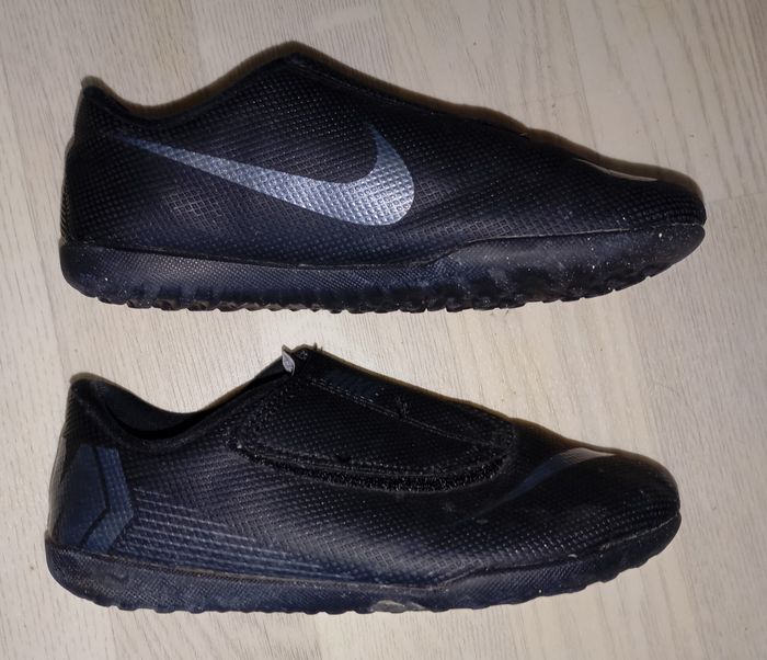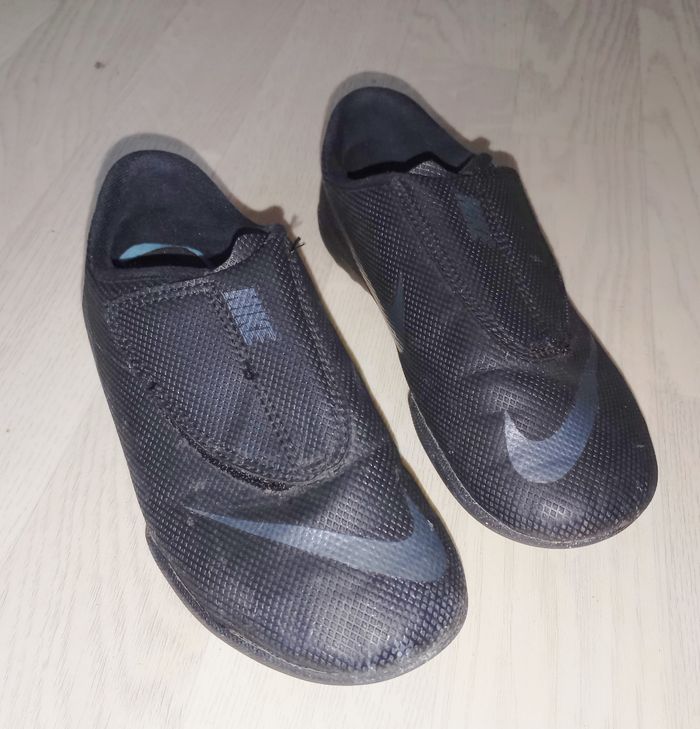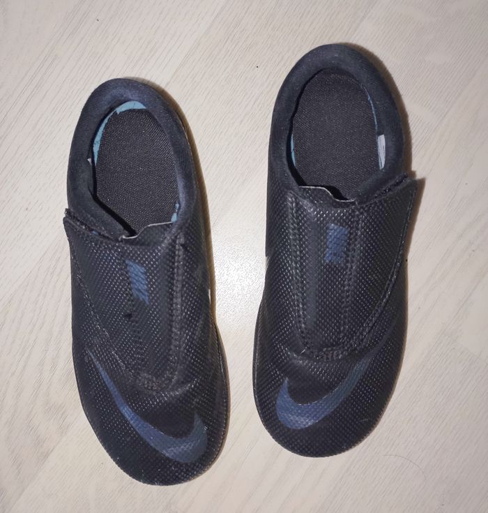Chaussures noires football terrain dur Marque : Nike Modèle : Mercurial P. 31.5 Très bon état général, peu portées (tâche sur la semelle impossible à retirer mais ne gêne en rien son utilisation)