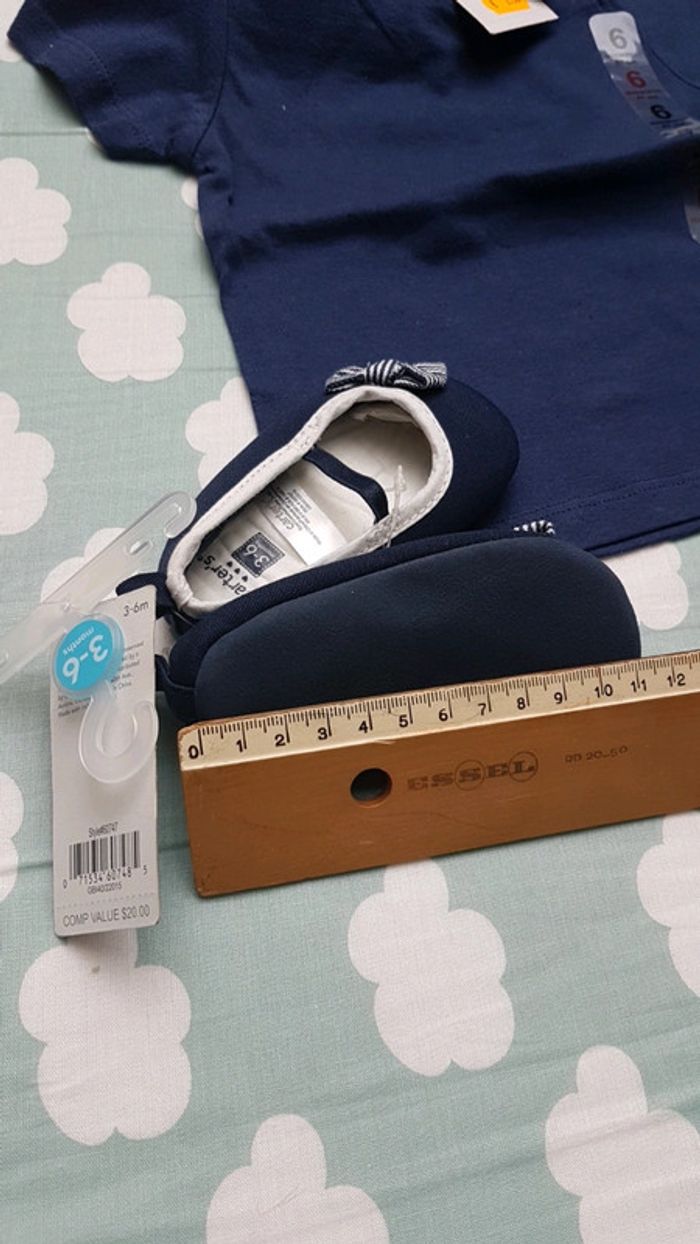 Tshirt avec petit noeud 67 cm /6 mois, marque KIMADI de chez Tati. Chausson avec noeud de chez carter's taille 3/6mois longueur 11cm largeure 5cm #nessnouss93fille6mois #cadeaunaissance