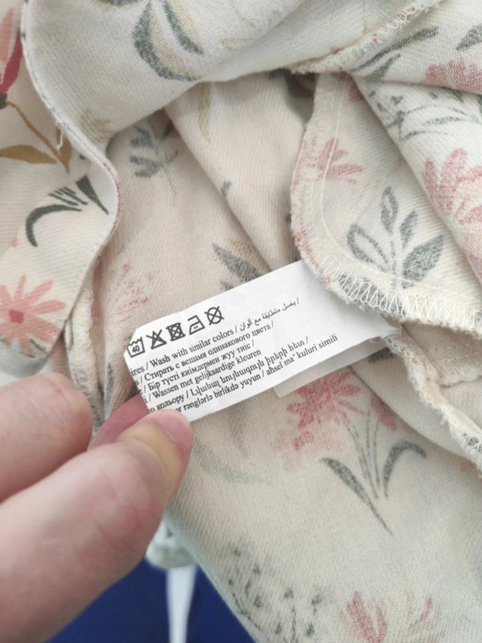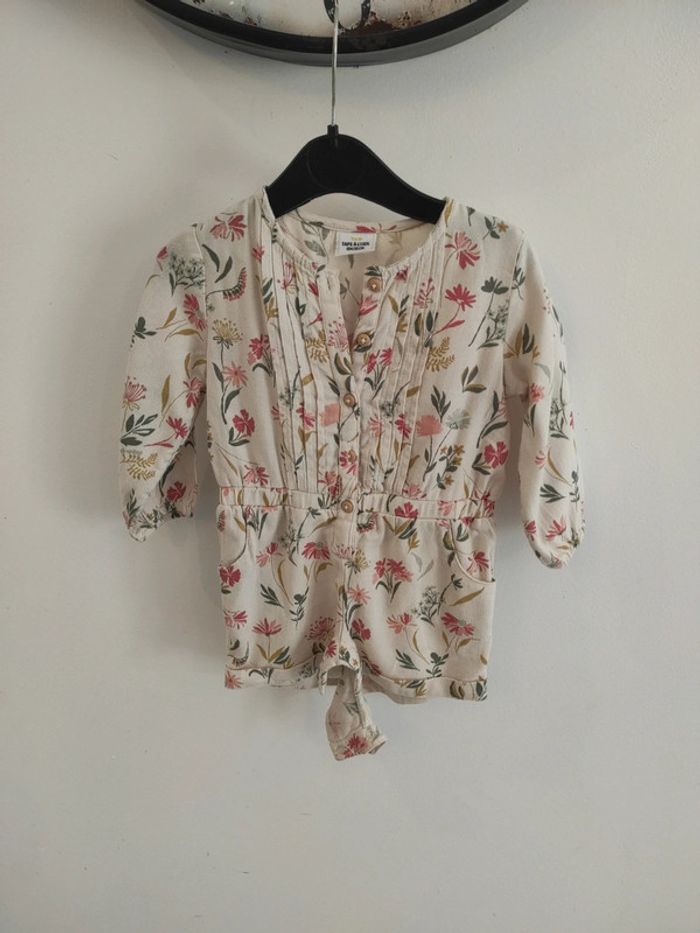 Combi-short d'hiver à manche longue, à porter avec un collant. Elle est beige avec des motifs fleurs verts et roses. Légèrement boulochée aux fesses. TAO. 18 MOIS