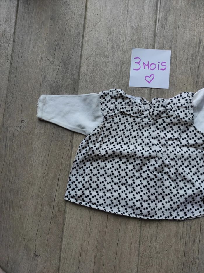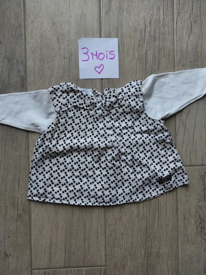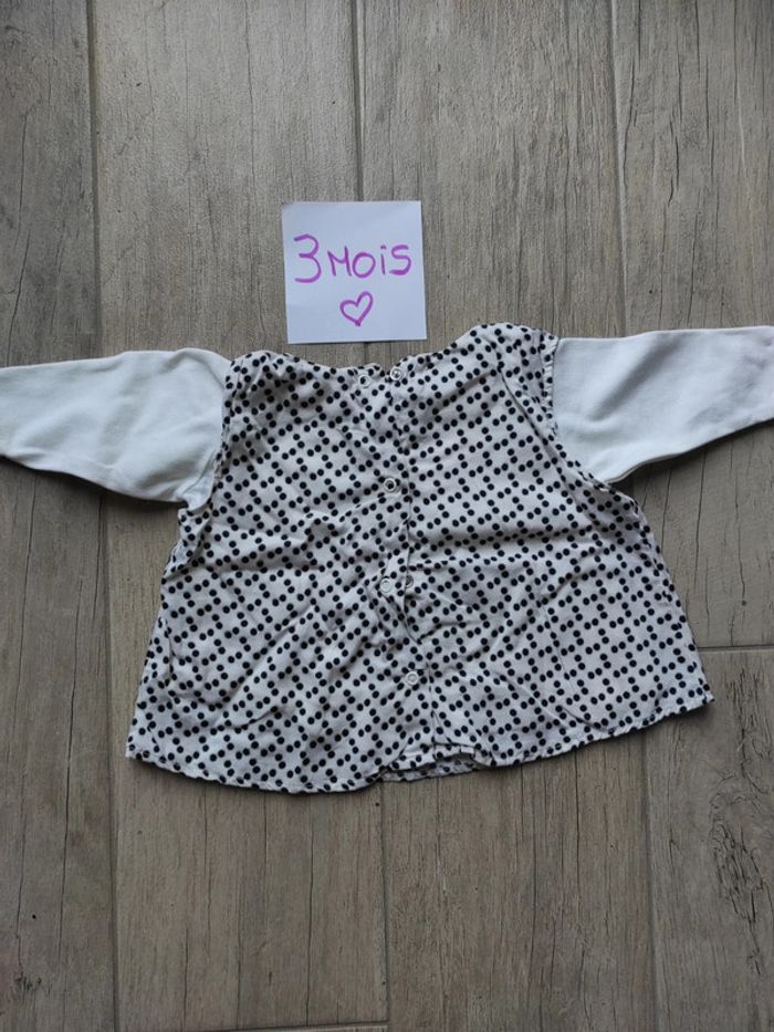 Jolie blouse manches longues blanches à pois noirs. S'ouvre complètement dans le dos avec des boutons pression Marque "Les bébés sont comme ça" , taille 3 mois (60cm). 🌸je vends d'autres vêtements en 3 mois, n'hésitez pas à créer un lot je ferai une réduction :) 🌸