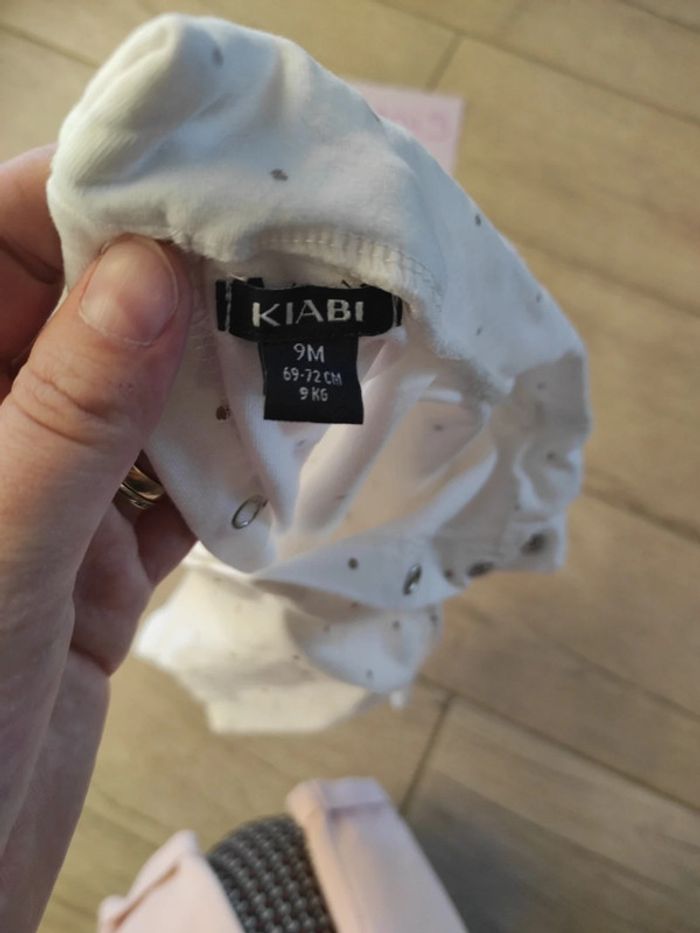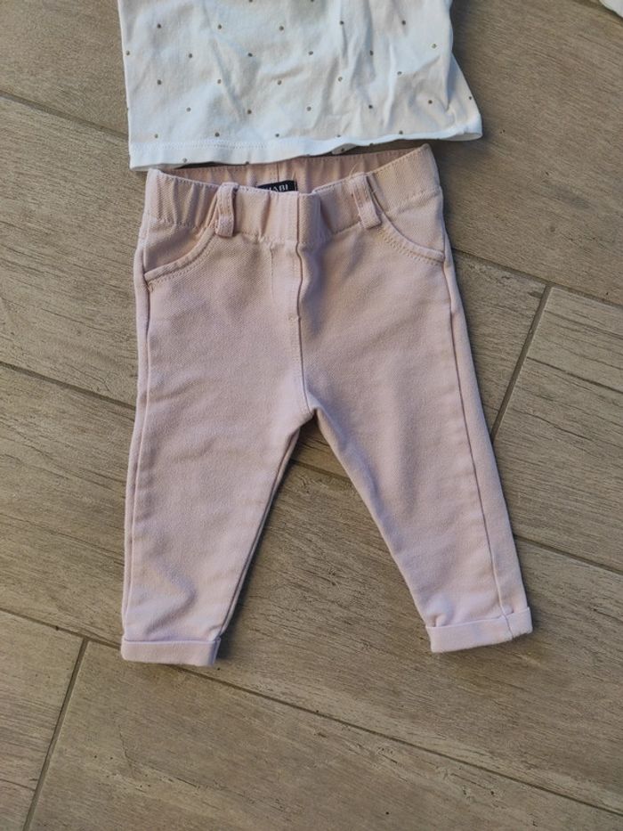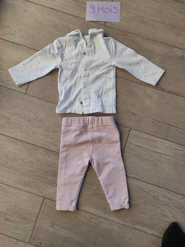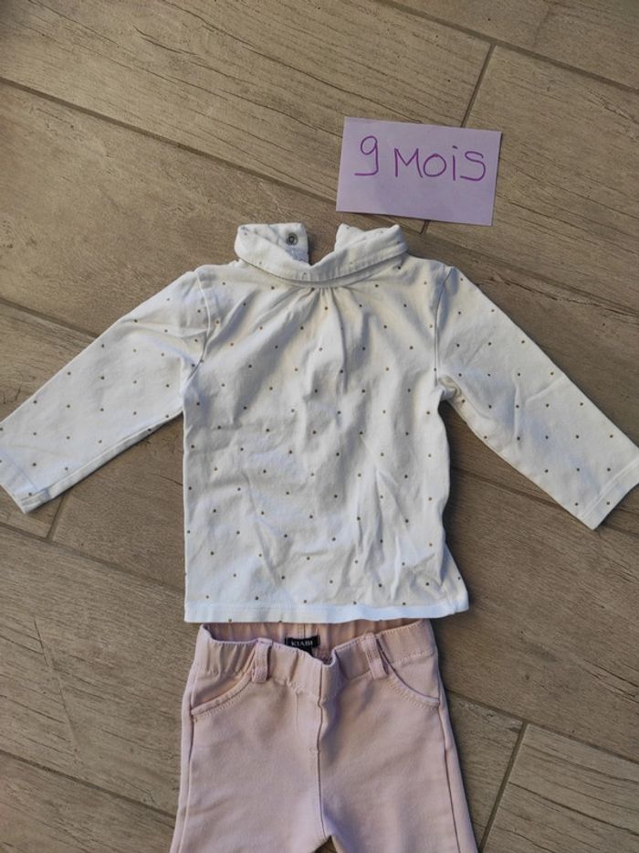 Joli ensemble pour fille pour l'hiver. Il est neuf (lavé mais jamais porté). Marque Kiabi. Taille 9 mois (69/72cm). Pantalon rose poudré et com roulé blanc à pois dorés qui s'ouvre complètement dans le dos avec des boutons pression (étiquette intérieure coupée) 🌸 réduction sur les lots