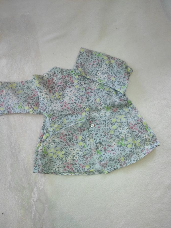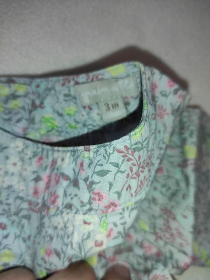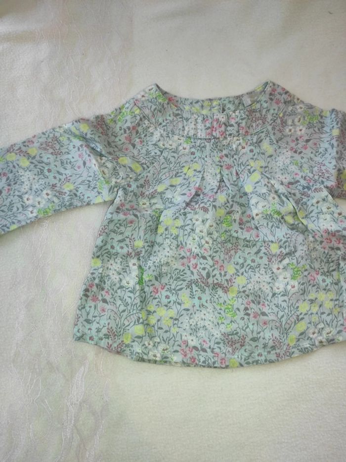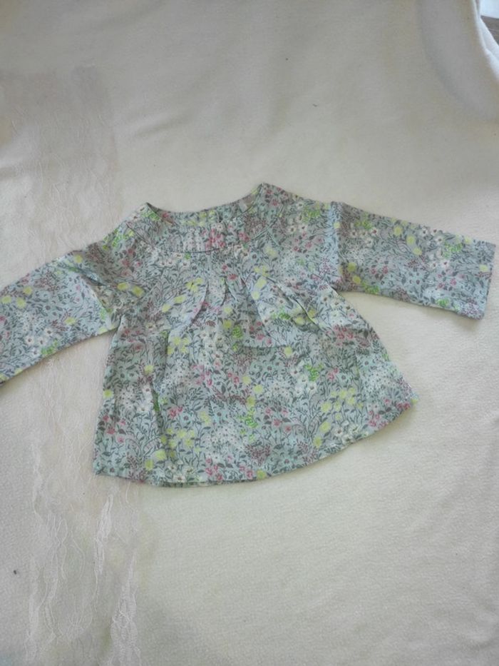 Un jolie chemisier taille 3 mois aux motifs fleuris. Les couleurs ont l'air terne sur la photo mais en vrai elles sont plus vives Marque Grain de Blé Comme Neuf
