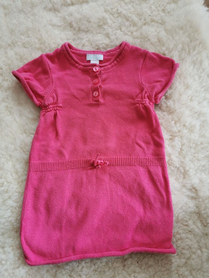 Très bon état. Petite robe pull rose fushia, avec son bonnet assorti et son bodie à petit col rose clair pour mettre en dessous. J'adorais cet ensemble ❤️.