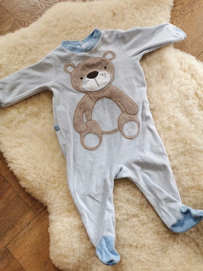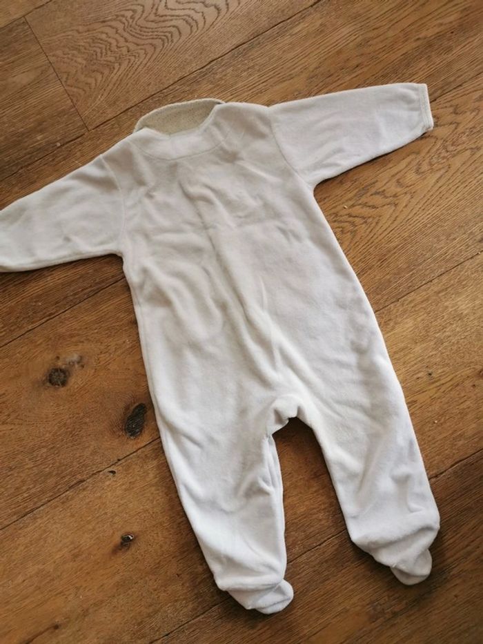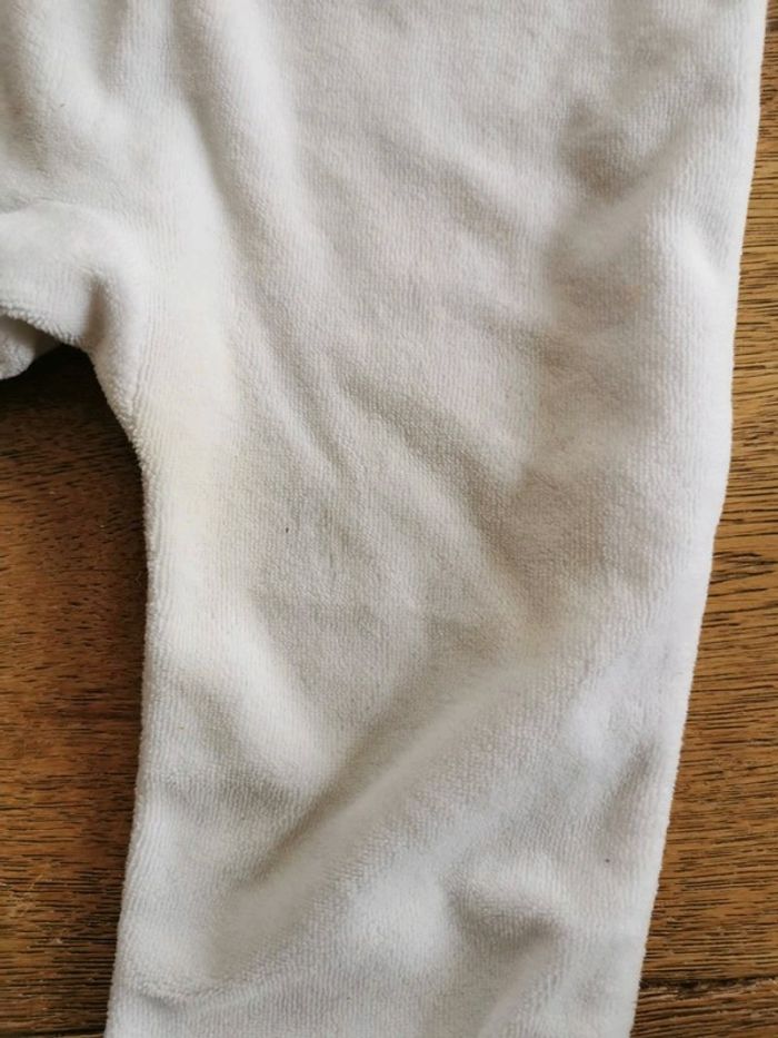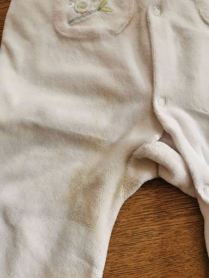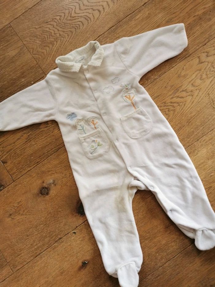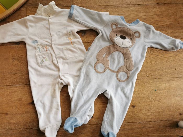 1 pyjama bleu avec ourson en très bon état sauf une toute petite tache (cf photo). Ouverture pressionnée au dos. 6mois. Marque inconnue. 1pyjama blanc avec petit col et petit oiseau. 6 mois, marque kimadi. Ouverture pressionnée sur le devant. État satisfaisant à cause d'une tâche à l'entrejambe gauche qui ne part pas.