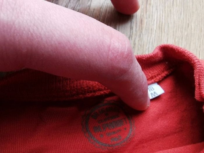 Très bon état. Marque qui tient bien aux lavages. Rouge avec un raton laveur et une inscription grise.