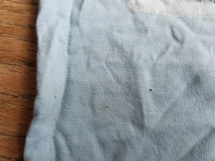 État satisfaisant : quelques micro tache et un tout petit trou. Taille 9 mois, 71cm. Il a vécu mais son ourson le rend encore tout mimi, et en lot avec d'autres articles je baisserais le prix. Au moins vous n'aurez pas peur que votre petit bout le massacre !