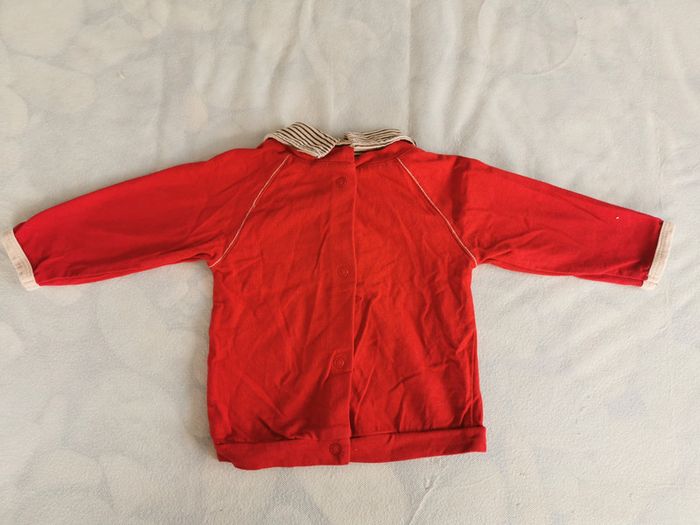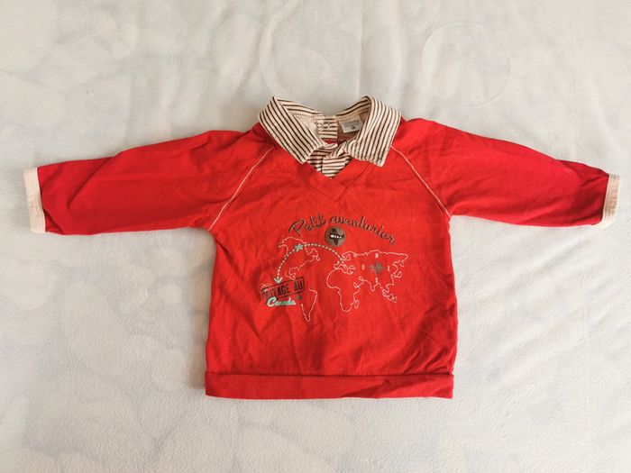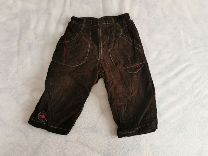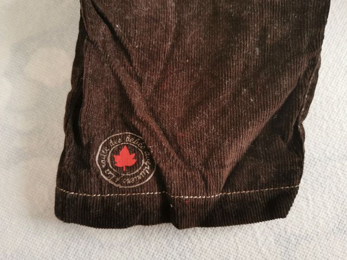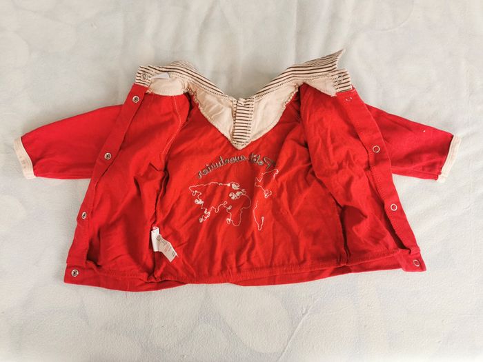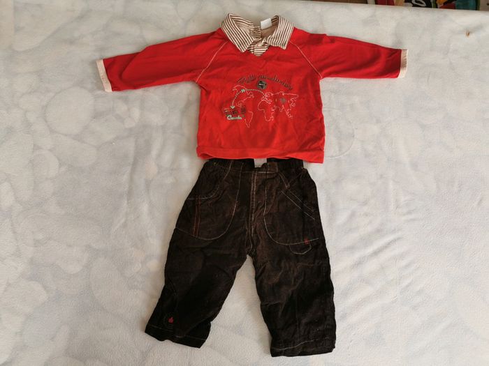Très bon état, ensemble tee shirt à manches longues /pantalon. 6 mois, 67cm Style classique, couleur vive, le tee shirt est rouge avec un petit col rayé marron beige, ce qui rappelle le pantalon. Pantalon touché velour, doublé coton, marron, avec petite feuille d'érable rouge en bas qu rappelle le. Tee shirt. Thème aventure avec l'imprimé du tee shirt.