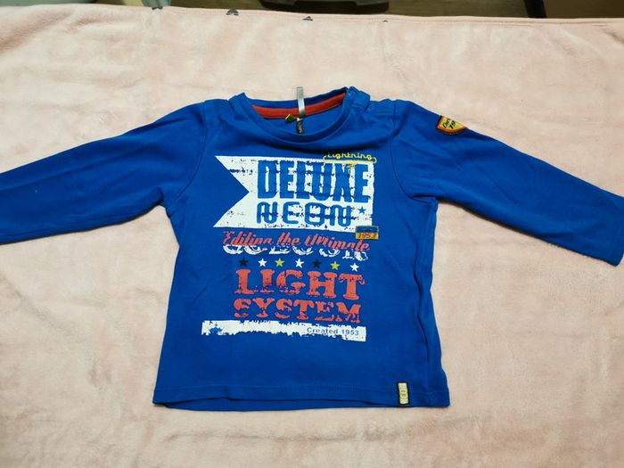 Tee shirten coton manches longues en bon état. Bleu avec imprimés. 23 mois, 86 cm