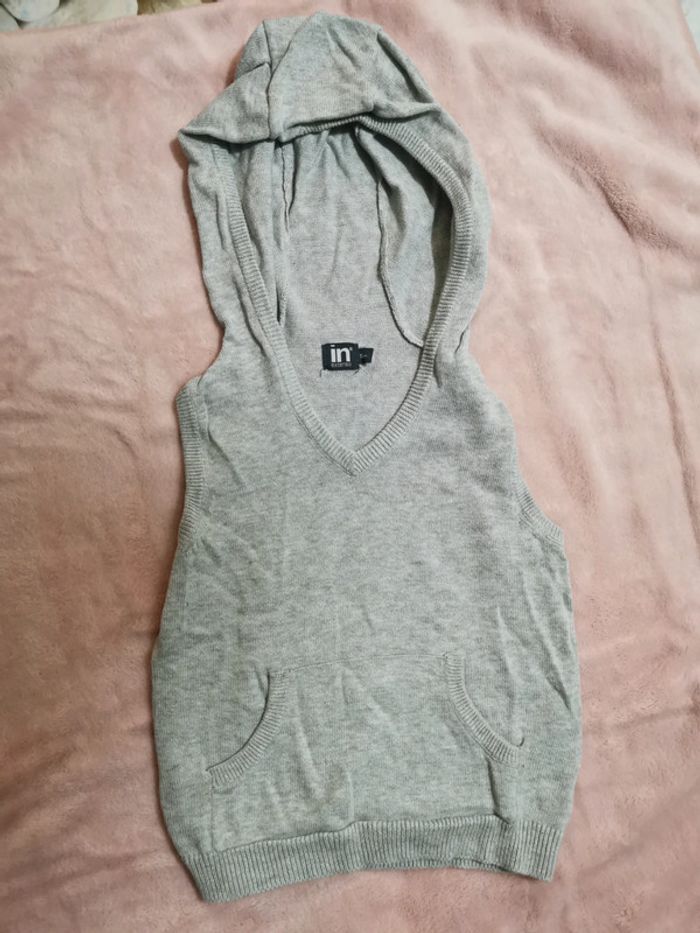 Porté mais reste en très bon état. Pull fin sans manche à capuche, marque in extenso.