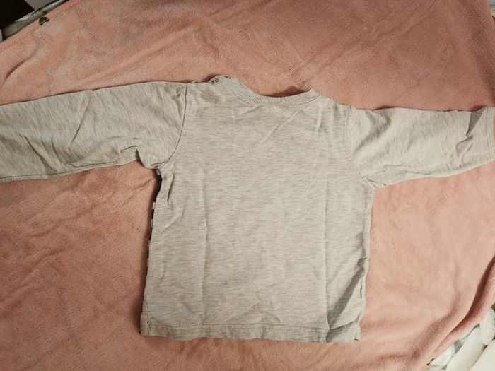 Tbe malgré une toute petite tache (cf 3e photo). 100% Coton epais 23 mois ou 86 cm. Gris et bleu marine avec un sous marin. Fermetures pression sur épaule gauche.