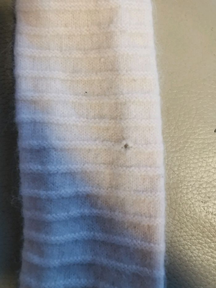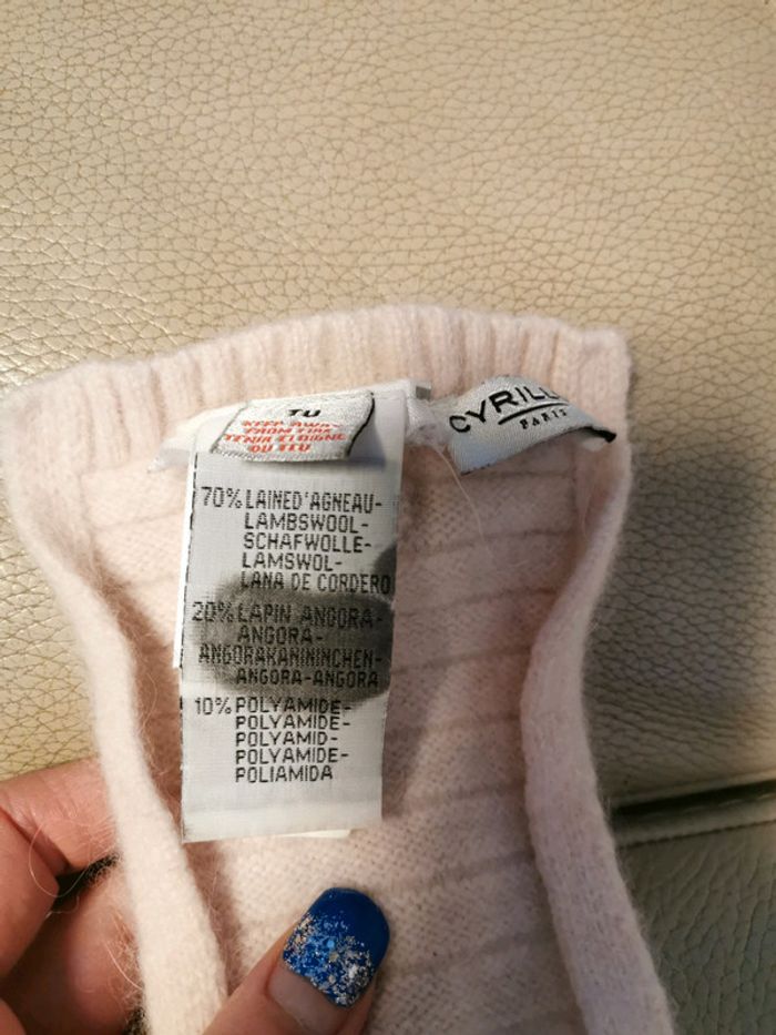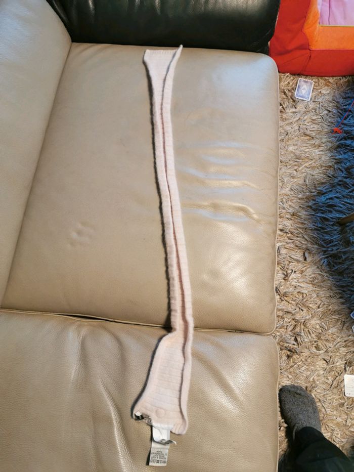 Écharpe rose pâle peu portée, toute douce, chaude et en tes bon état, mis à part un micro trou (cf 5e photo). 70%laine d'agneau 20%laine lapin angora 10%polyamide Taille unique mais largeur 11cm et longueur 93 cm donc entre 1 et 3 ans je dirais.