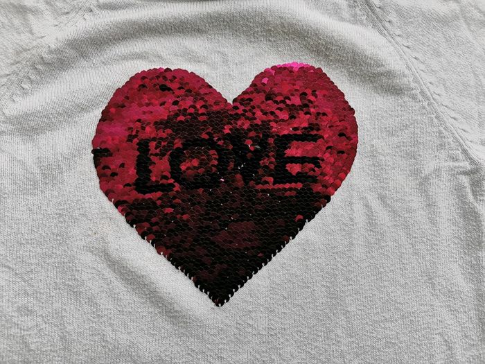 On voit qu'il a été porté et lavé mais il reste e' bon état. Pull fin, aucun sequin manquant. Ma fille l'aimait beaucoup !