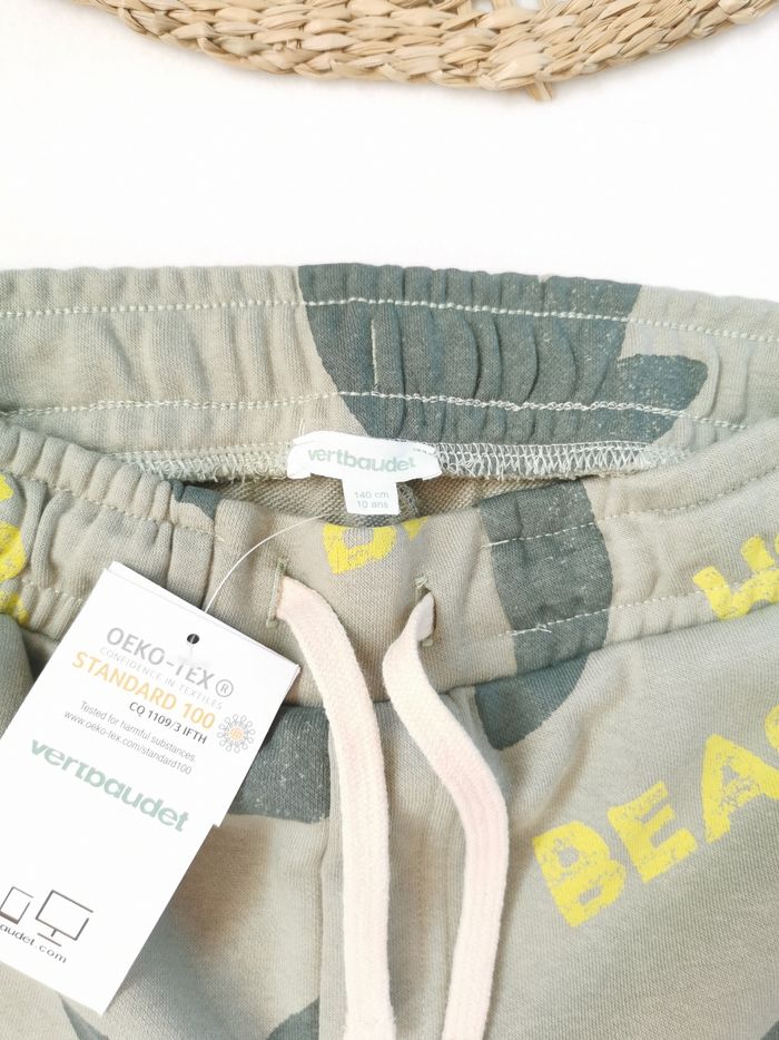 🧒 Bermuda short en molleton🧒 Vertbaudet 🖊️ ÉTAT ✅️: Parfait👌 - Avec étiquette🏷️- Jamais porté 🆕 🖊️ DESCRIPTION: ▪️Taille 10 Ans - 140 cm ▪️Matière: 77% coton - 23% polyester ▪️Taille elastiquée avec cordons de serrage ▪️2 Poches latérales ▪️1 Poche arrière ▪️Impression: Beach 🏖️ ▪️Couleur: Vert 🟢 🔵🔵