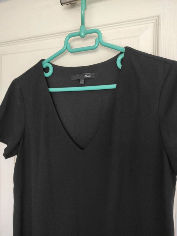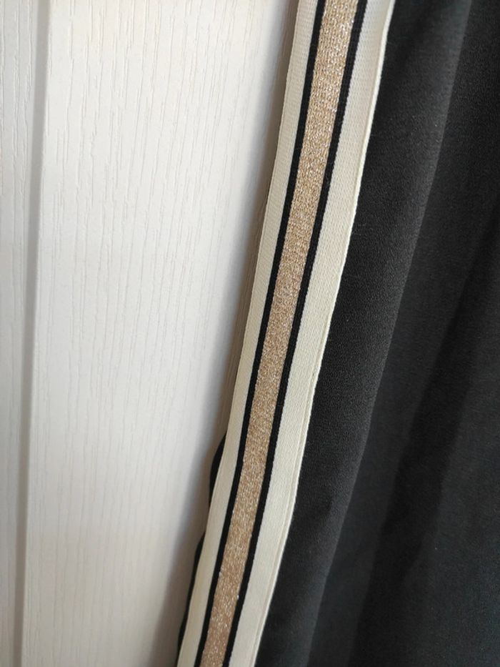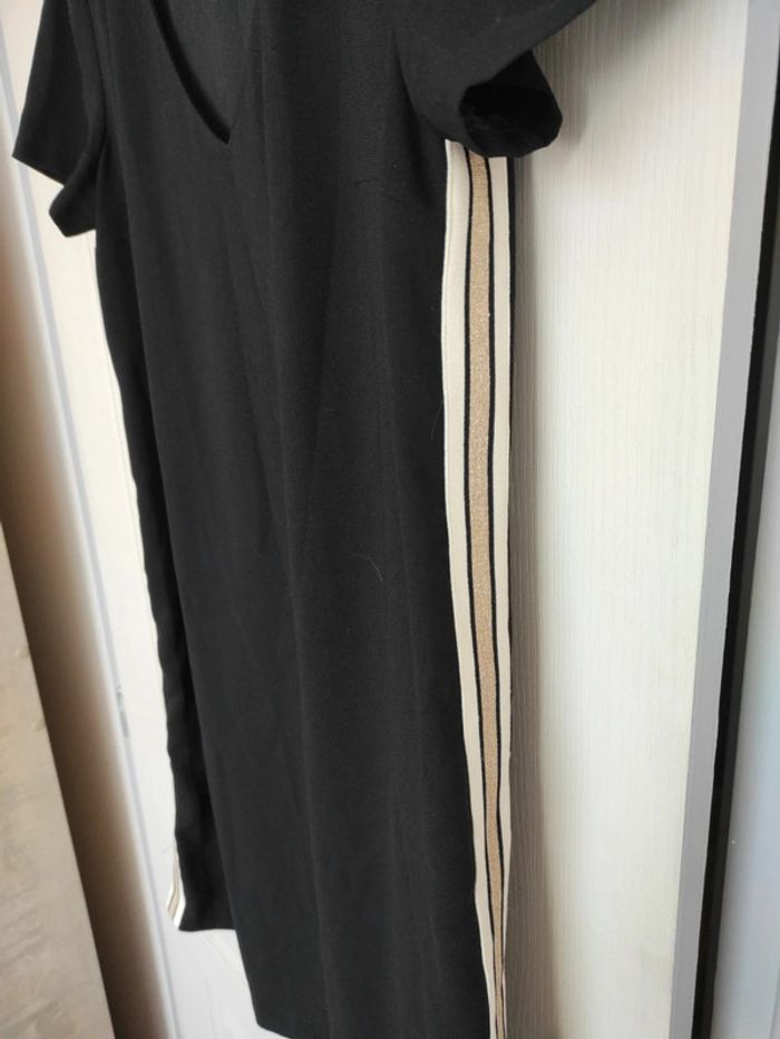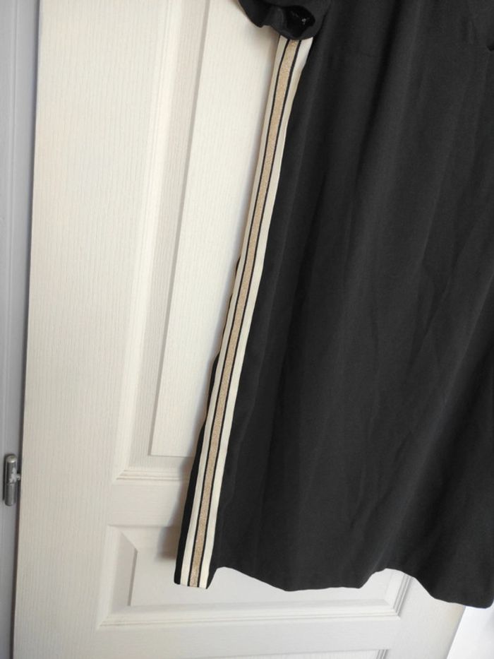 Robe noire col v. Longueur 90cm env et largeur 46 cm env niveau poitrine. Doublé. Très jolie rendu. Bande doré sur le côté. Bien noire. Comme neuve