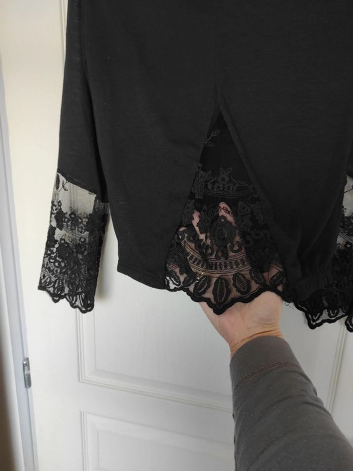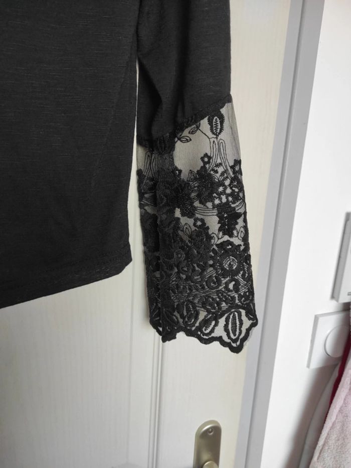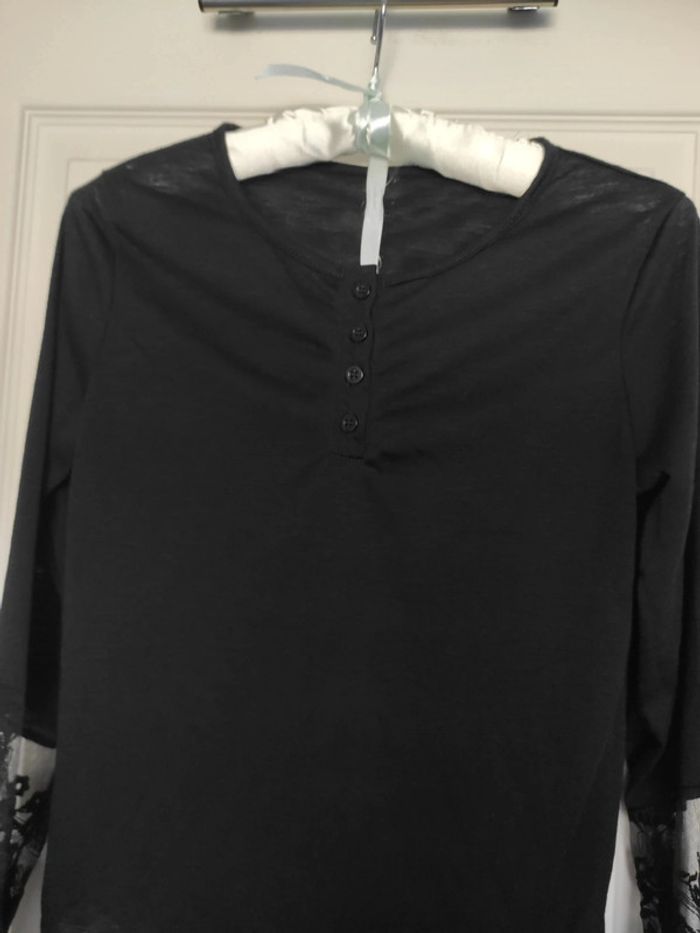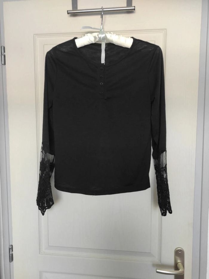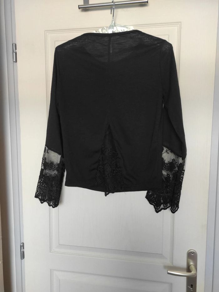 Haut noir avec dentelle au dos et bas de manche. Petits boutons sur le devant. Elasthanne. Jamais porté.