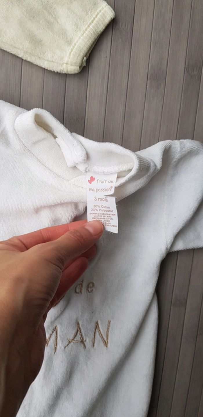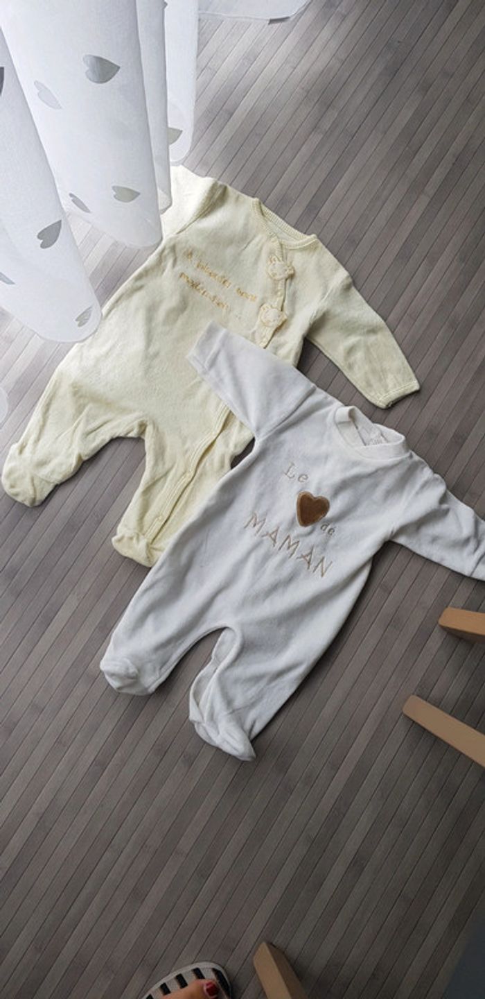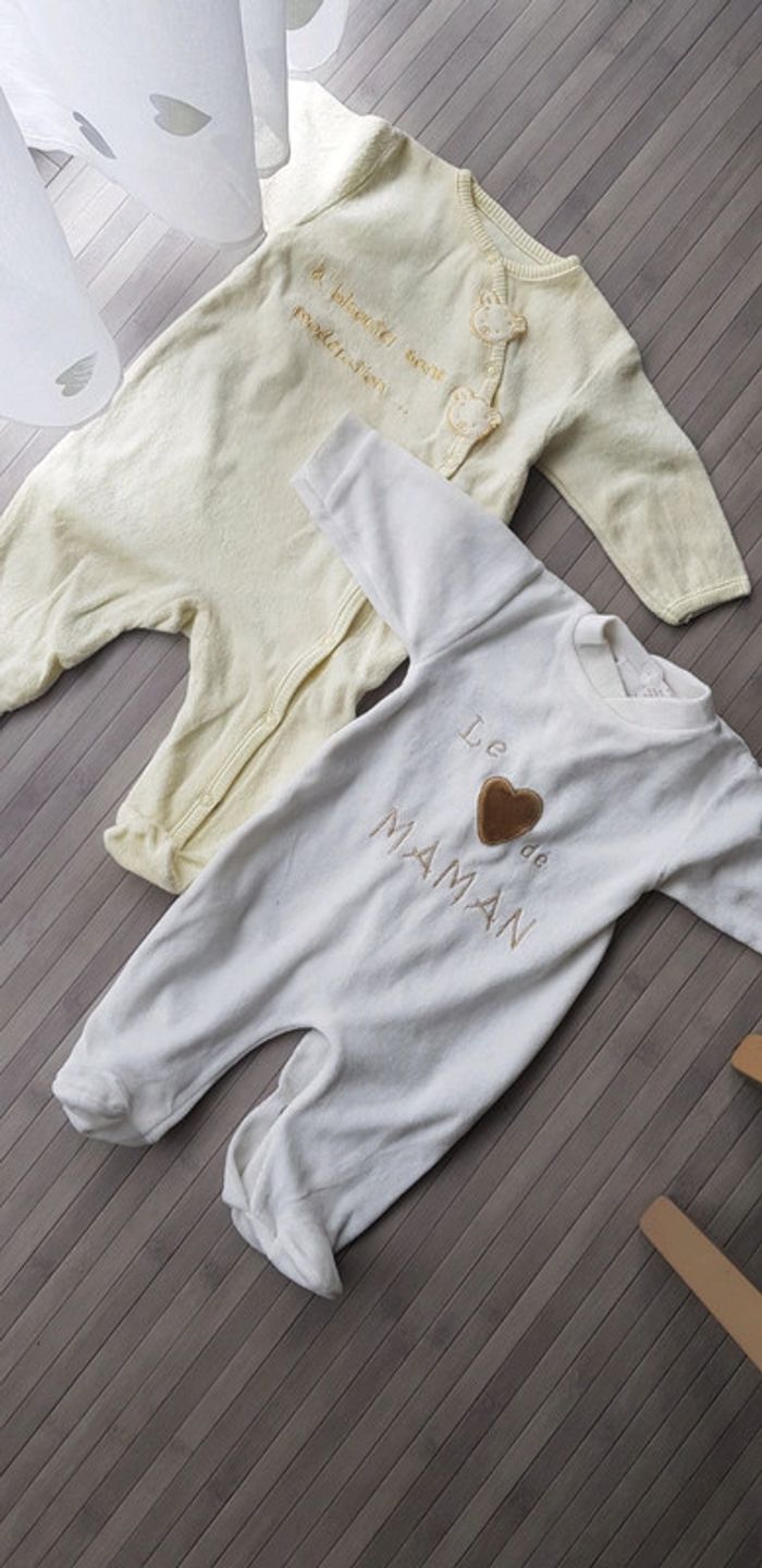2 grenouillères matière velours 3mois En parfaite état, la jaune est neuve