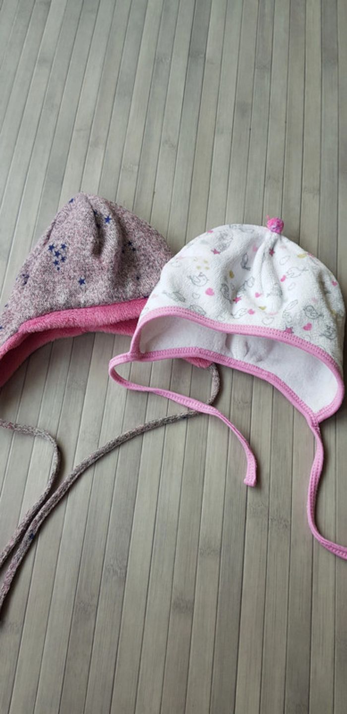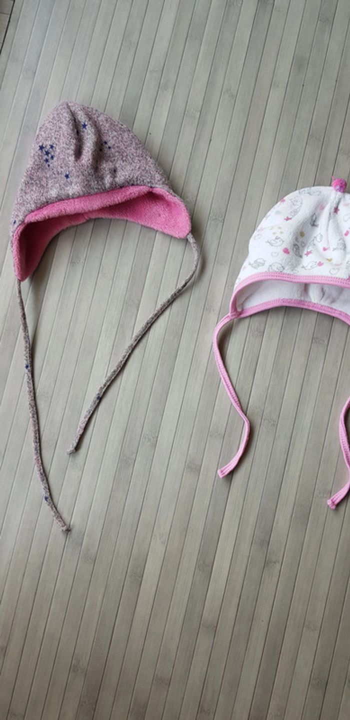 2 Chapeaux d'hiver pour bebe fille porter très peu bébé né fin d'hiver. En très bon état comme neuf Matière polaire