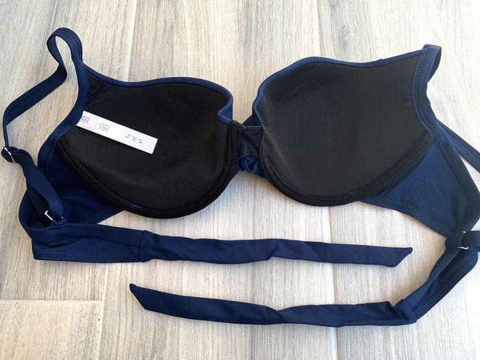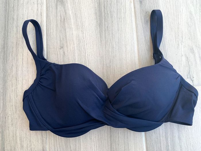Haut de maillot de bain à armatures bleu marine Marque La Redoute collection Taille 95C Neuf jamais porté Effet twisté sur l'avant Bretelles réglables Attaches à nouer au dos pour un ajustement parfait Joli basique facile à assortir avec votre bas de maillot préféré !