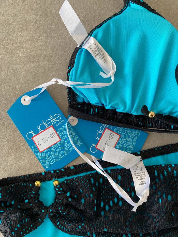 Ensemble maillot de bain 2 pièces bel effet crochet noir avec doublure bleue Marque anglaise Audelle Swim Neuf avec étiquette Valeur boutique 62€ (haut 39€ + bas 23€) Haut triangle taille 38 avec rembourrage amovible, tour de cou et tour de dos à nouer pour un ajustement parfait. Bas de bikini taille 36 avec fantaisie boucle dorée sur l'avant.