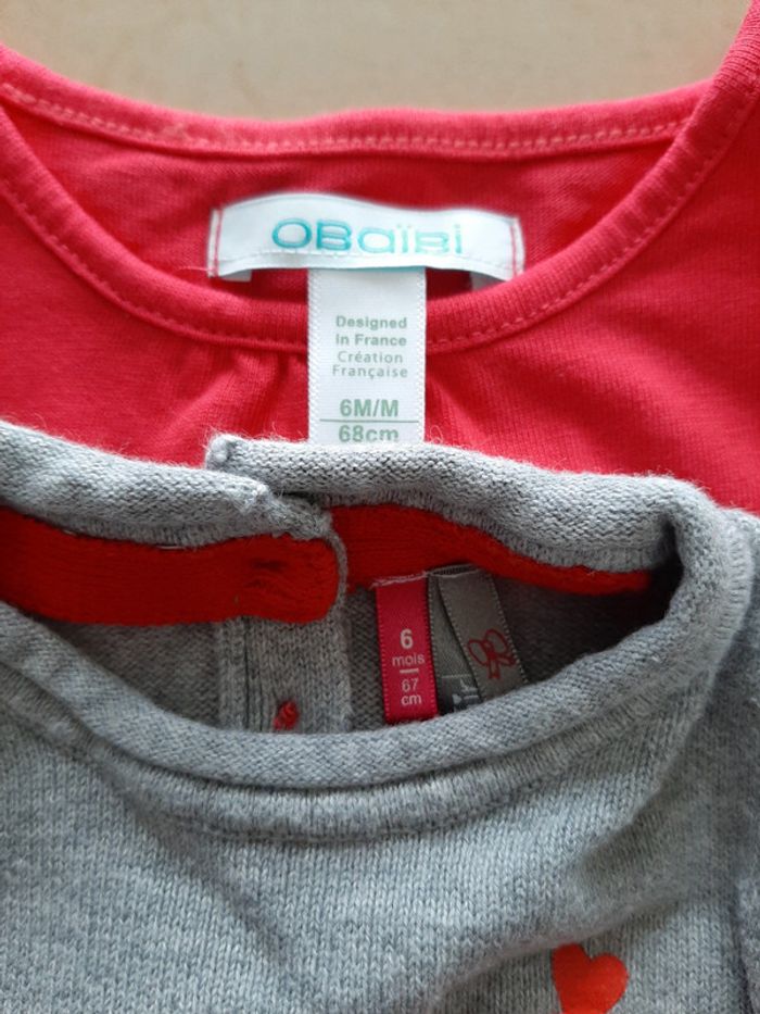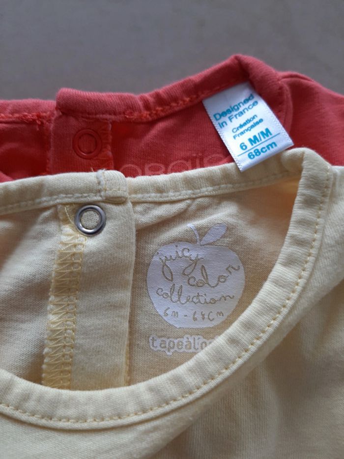 A vendre lot de 4 tee shirts manches courtes fille 6 mois plusieurs marques Le rose et le orange : okaidi Le jaune : Tao Le gris (façon pull) : orchestra Tout est en très bon état Pas de trou ni de tache #marionm51_6mois