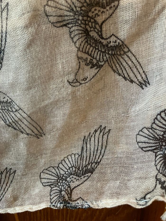 Foulard avec des oiseaux imprimés. Filé à quelques endroits (voir dernière photo) mais ne se voit pas quand il est porté