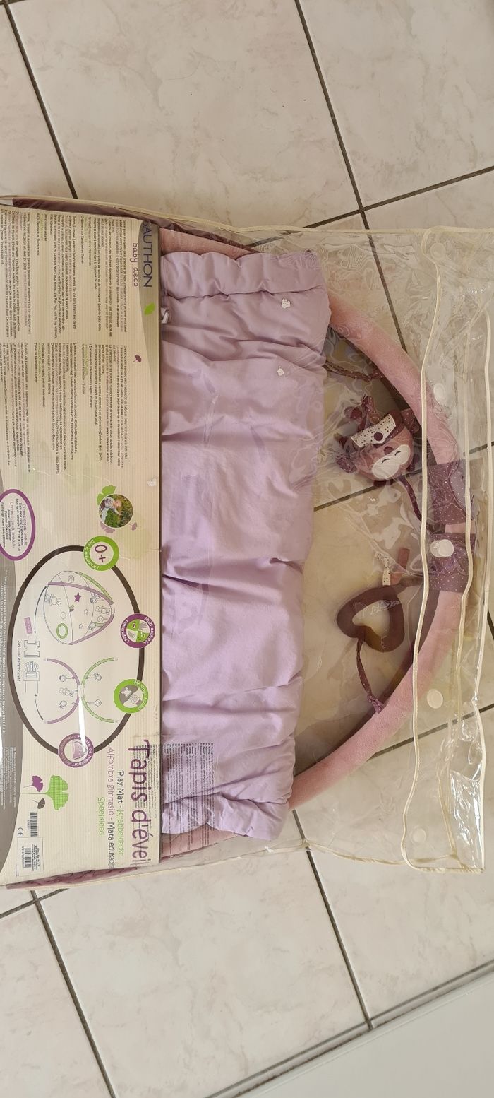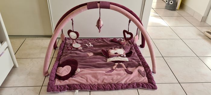 Vends tapis d'éveil de marque Sauthon, modèle Mamzelle. Couleur prune et violet. Arche de jeu déclipsable pour laver le tapis en machine. Matière toute douce. Excellent état car très peu servi.