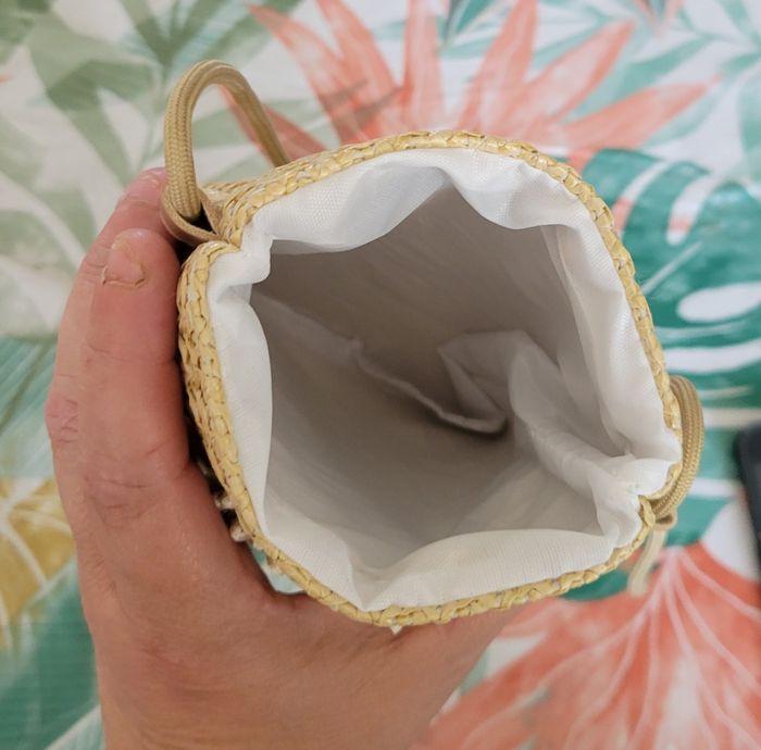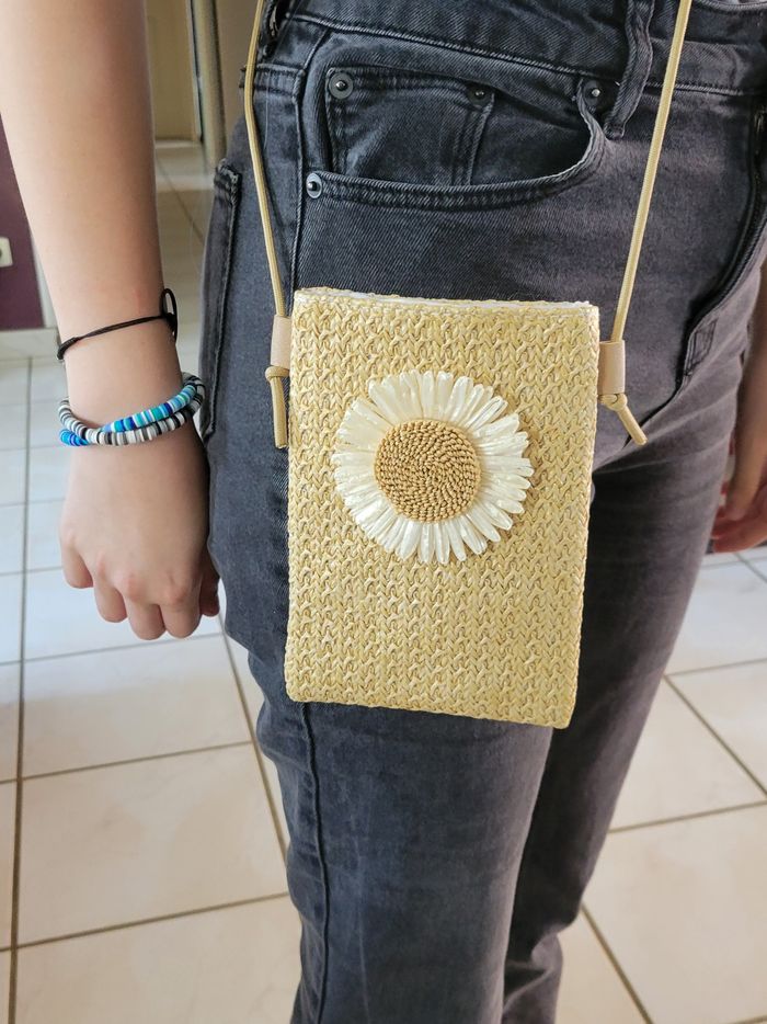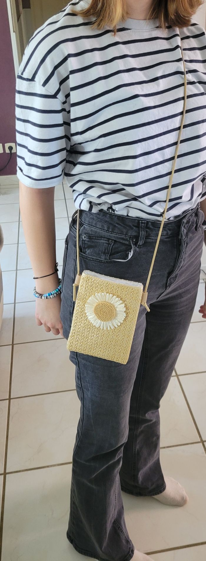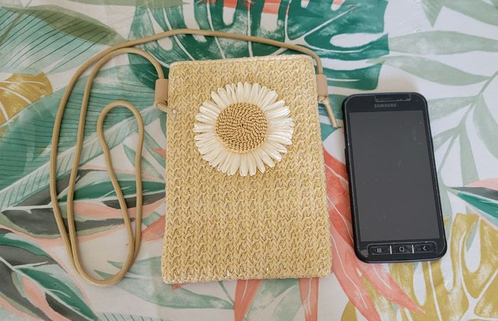 mini sac pour telephone portable aux couleurs de l'été. effet paille + fleur tournesol. Ultra pratique quand on porte des vetements sans poches. Hauteur 19 cms. Sous blister. Envoi rapide et soigné par MONDIAL RELAIS ou COLISSIMO.