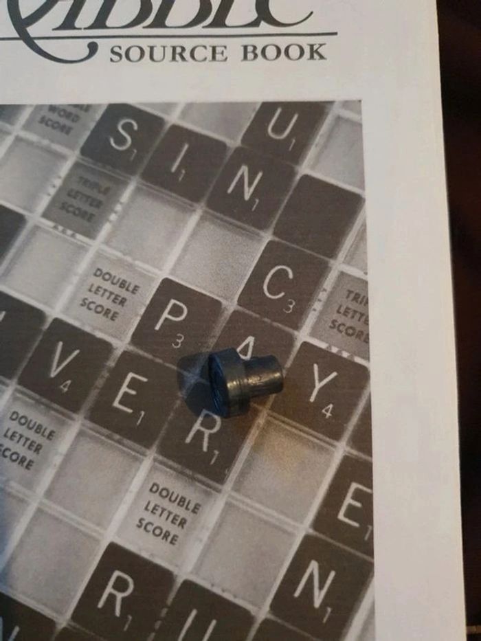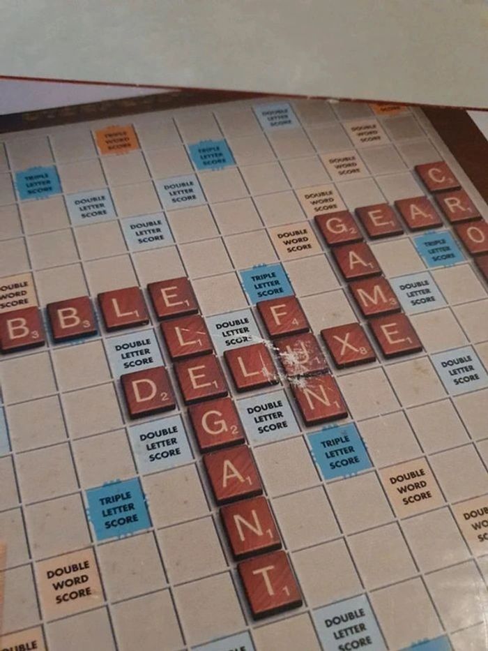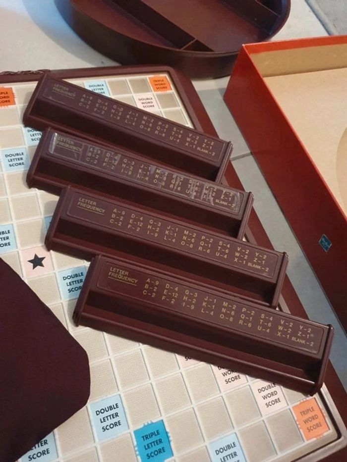 Scrabble Deluxe Tournant. Version anglaise mais vous pouvez très bien jouer en français. En très bon état, complet et très qualitatif. A l'intérieur le seul petit défaut c'est les autocollants sur les chevalets qui se décollent un peu sur un côté pour certains. La boîte présente des traces d'usures également mais ça reste plutôt léger (voir photo). Noté bon état pour les tatillons mais pour moi il est en très bon état. Un pied en caoutchouc de rechange. Sera envoyé en étant protégé au maximum. #jeu #jeux #deluxe #Scrabble #turntable #parkerbrothers