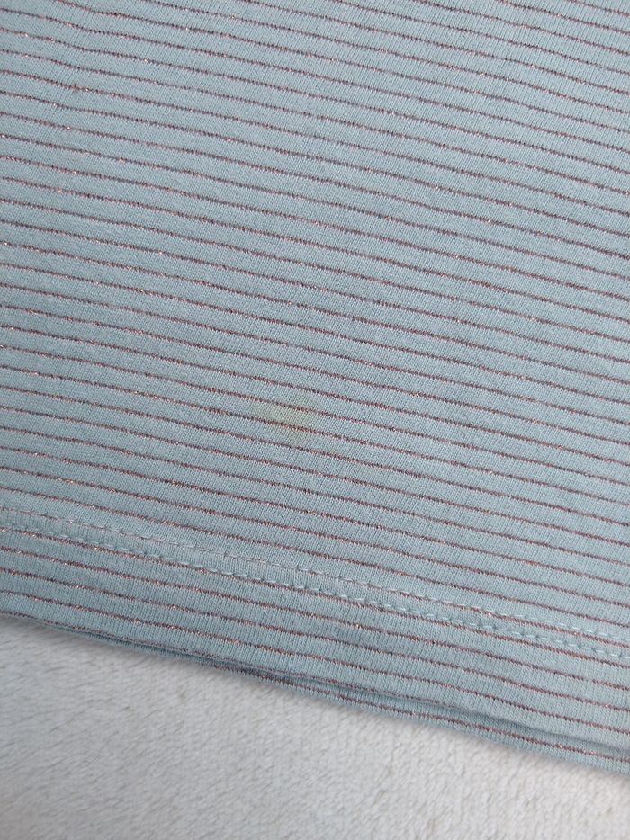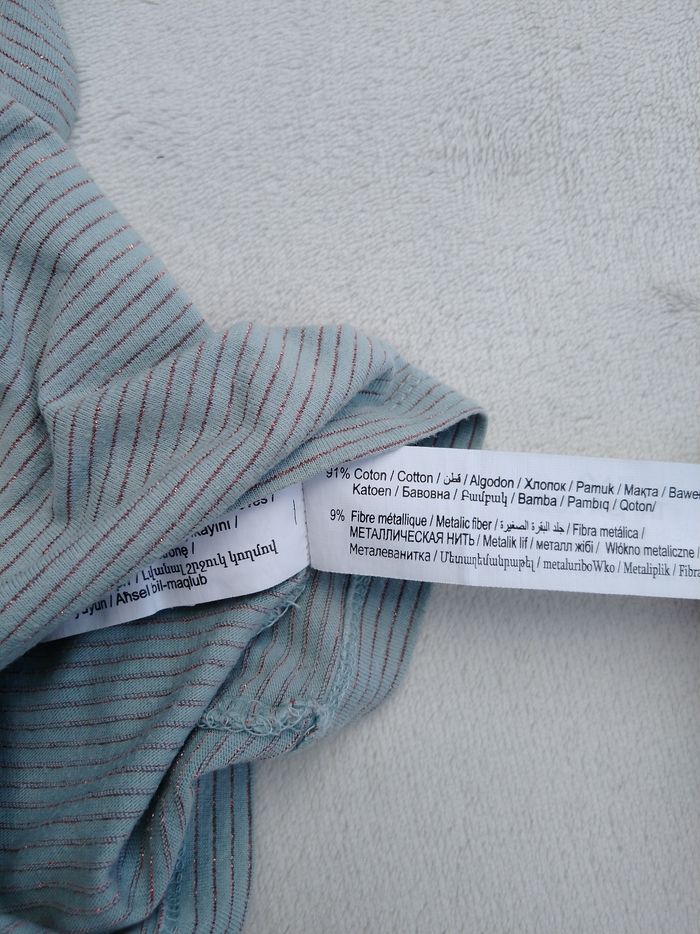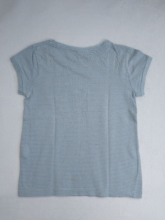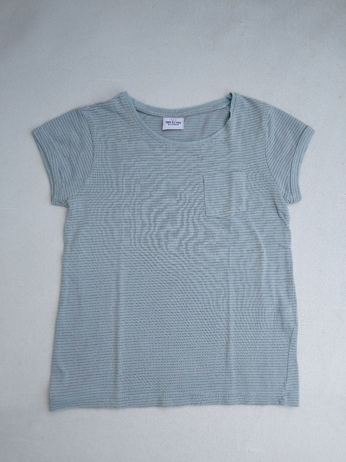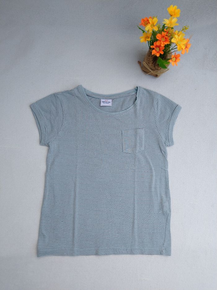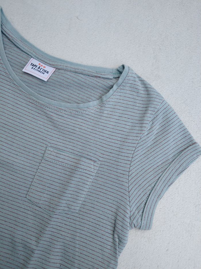 T-shirt à manches courtes Marque Tape à l'œil Taille 5 ans, 110 cm • Coloris bleu gris • Fils métalliques cuivrés, rayures horizontales • Poche supérieure • Coton fin • Petite tache au dos En très bon état #evelyne_filles_5ans #evelyne_filles