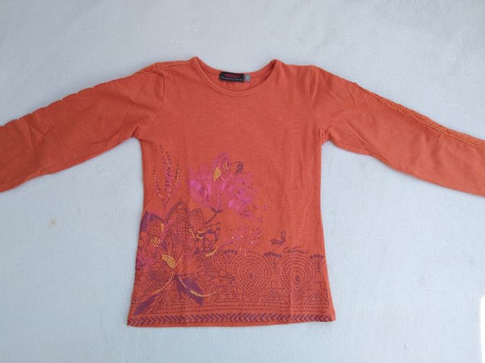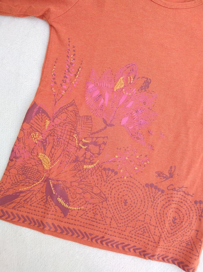 T-shirt à manches longues Marque Catimini Taille 5 ans, 110 cm • Coloris orange, violet • Imprimés fleurs • Broderie sur les manches • Coton fin • Imprimés qui craquellent En très bon état #evelyne_filles_5ans #evelyne_filles