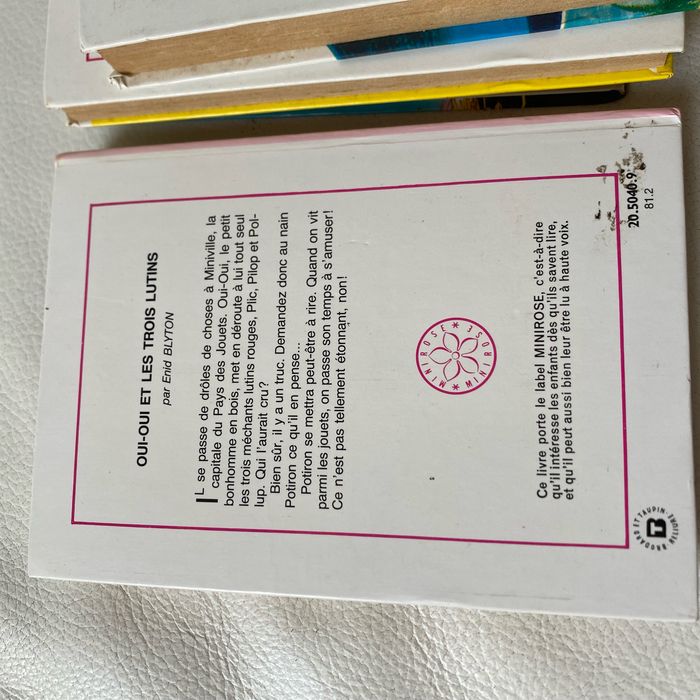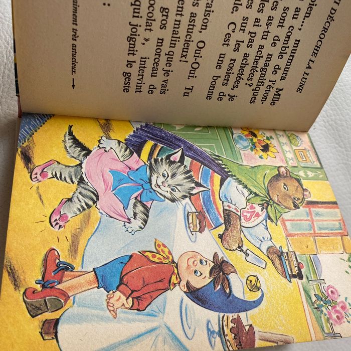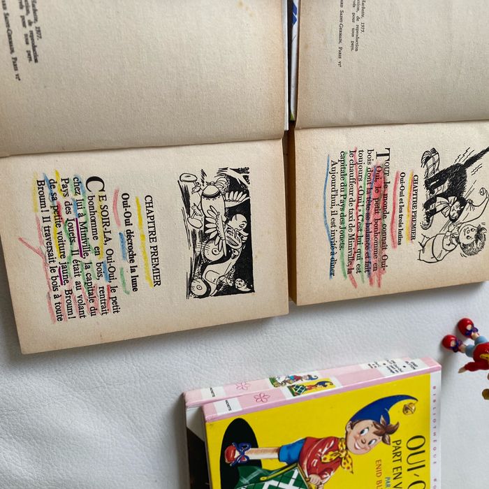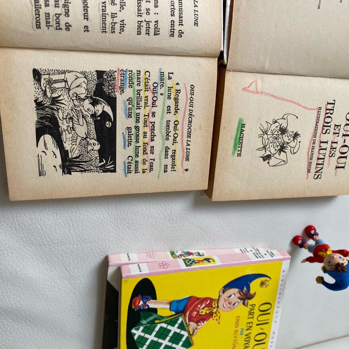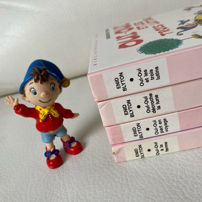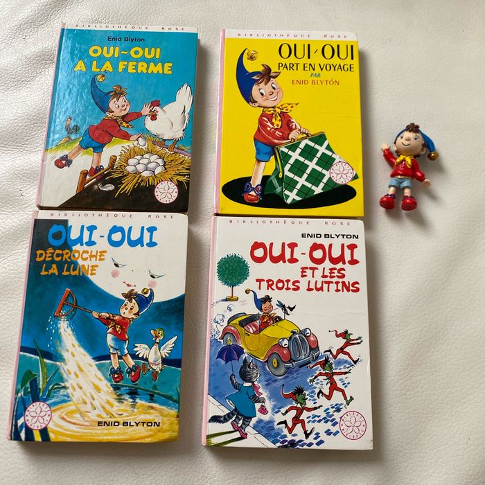 Lot 4 livres illustrés vintage oui oui et une figurine récente oui oui à la ferme. oui oui Part en voyage oui oui Décroche la lune oui oui Et les trois lutins Bibliothèque rose Label minirose Hachette Enid Blyton 2 sont colorés aux premières pages, voir photos