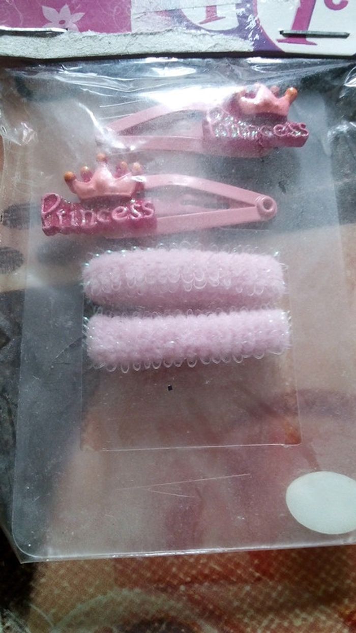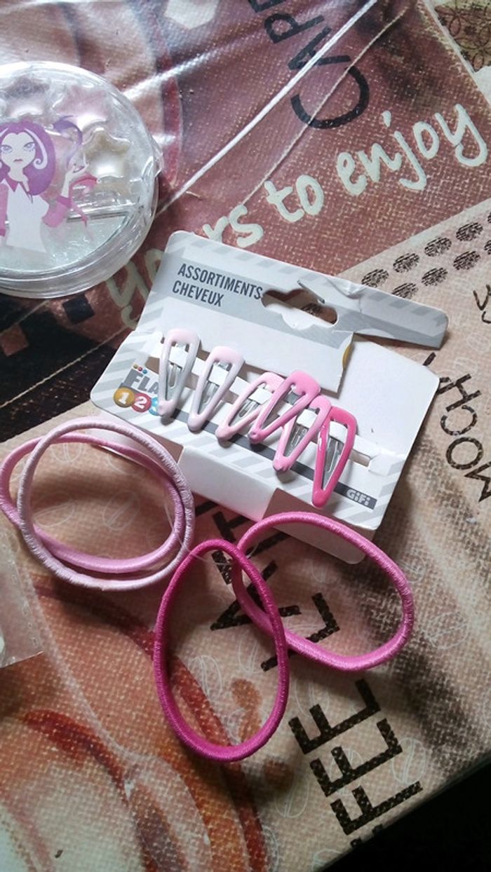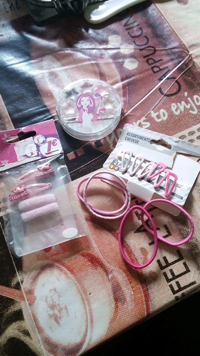 Assortiment de 3 articles barrette élastique et un petit kit maquillage