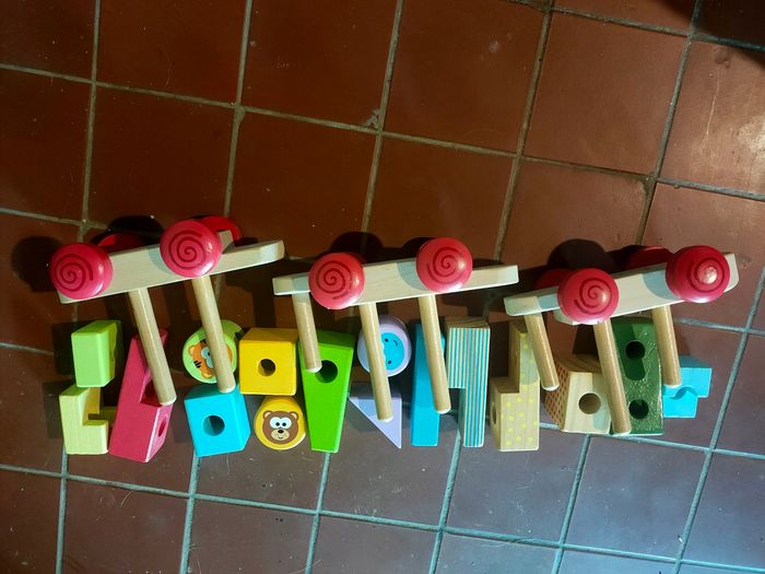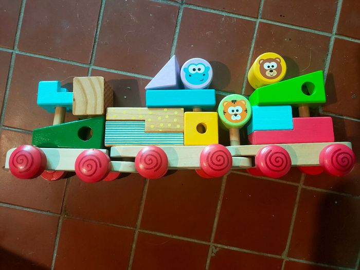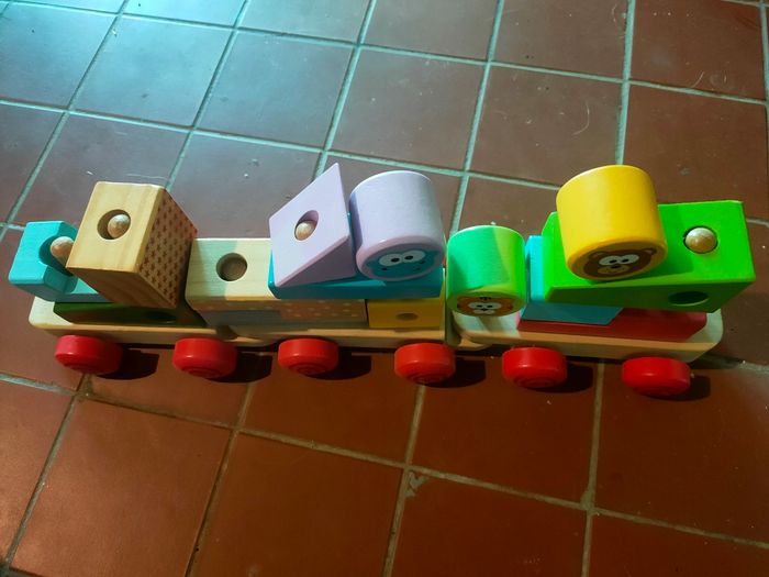 Jeu d'éveil en bois. Petit train composé de 3 wagons et de 16 pièces de différentes formes et couleurs.