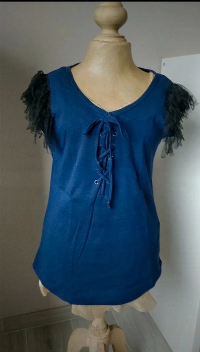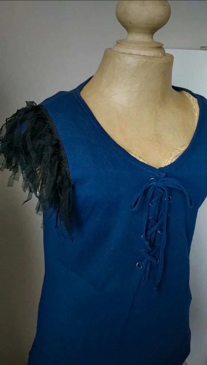 Débardeur marine, avec tulle noir aux épaules. Lacets à nouer devant. Jennyfer, taille L