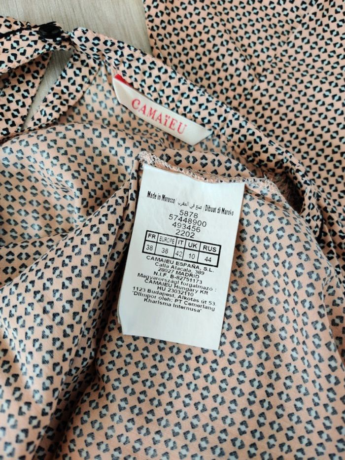 Blouse beige rosé à petits motifs. Manches 3/4 Camaïeu, taille 38