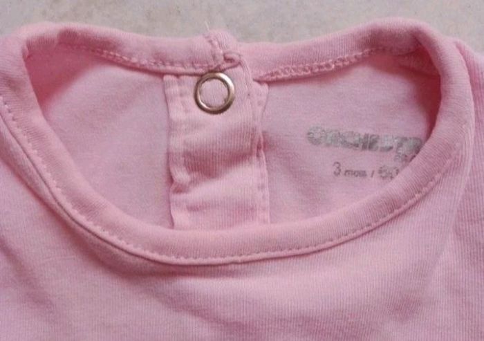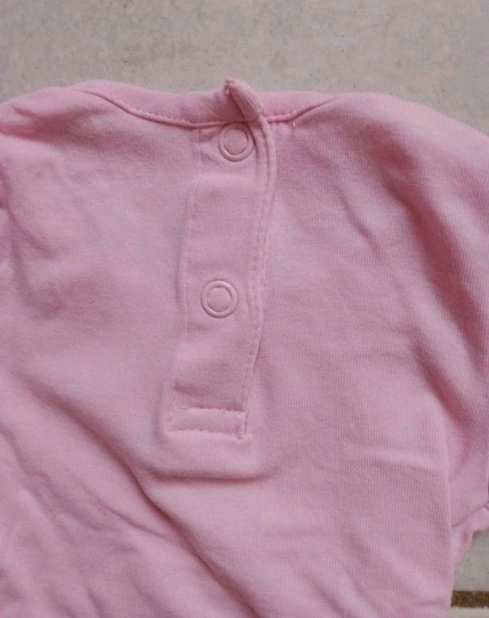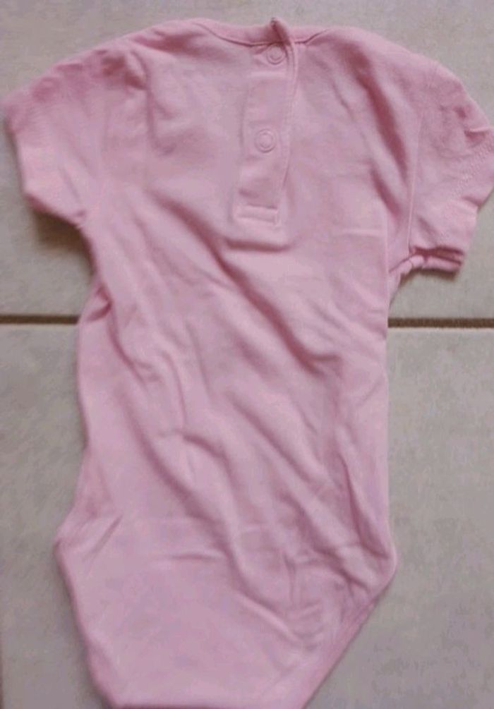 Body rose à manches courtes. Il y a un accroc sur le tissu au niveau des pressions à l'entrejambe (photo) qui n'empêche cependant pas l'ouverture et la fermeture du pression.