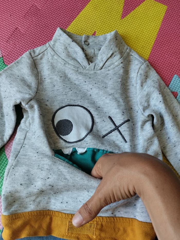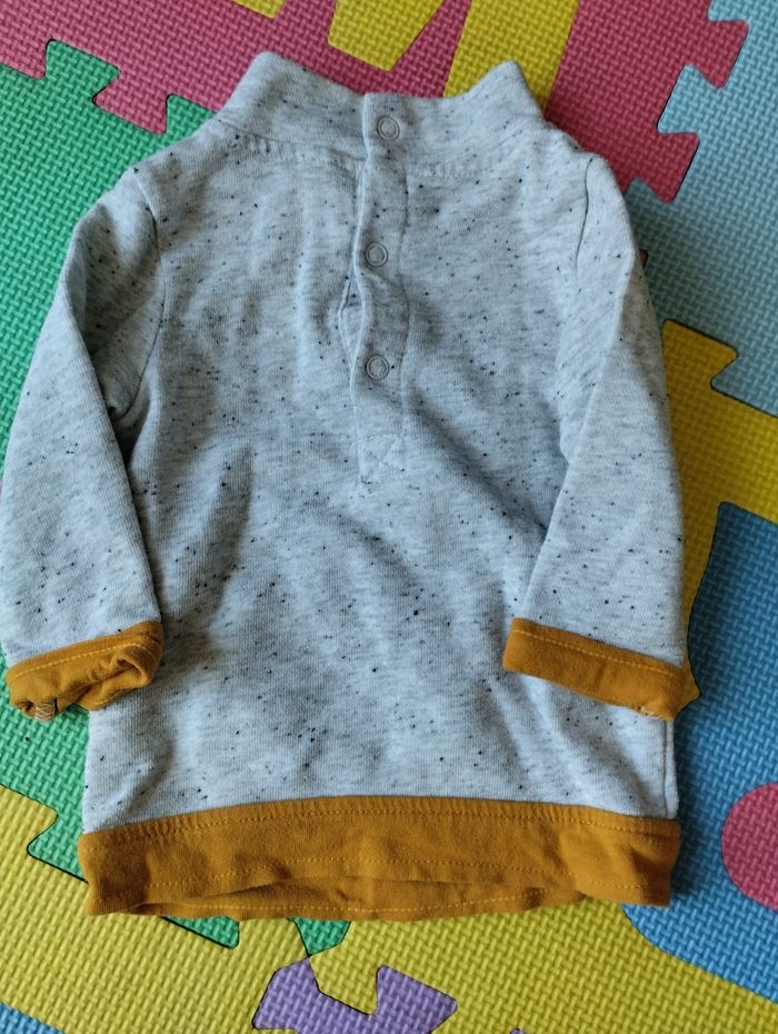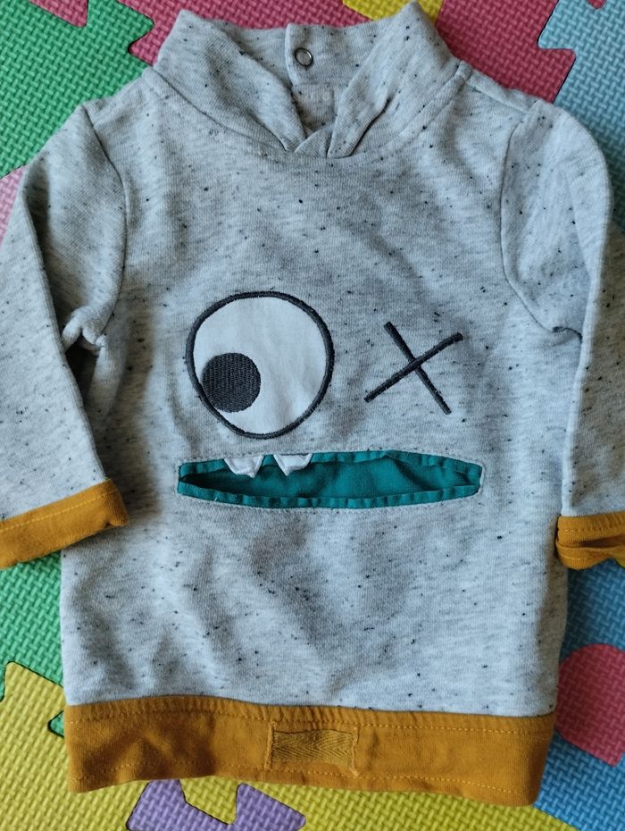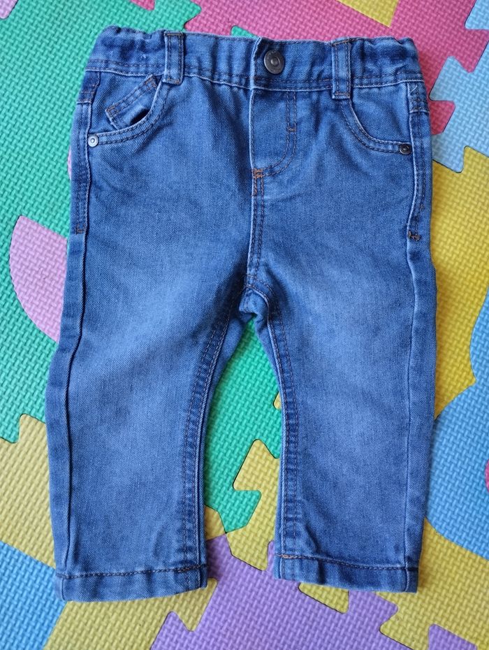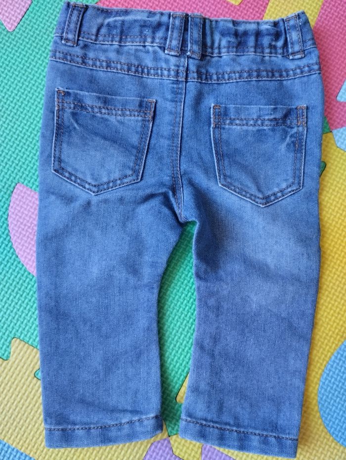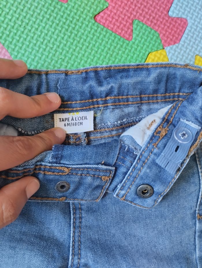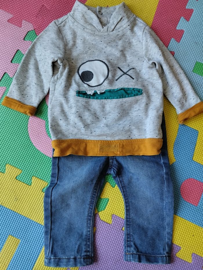 Ensemble : pantalon jean, ceinture réglable et sweat, boutons au dos. Taille 6 mois. Marques Orchestra et TAO. Très bon état.