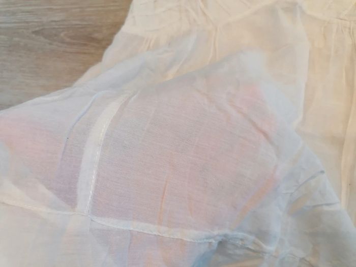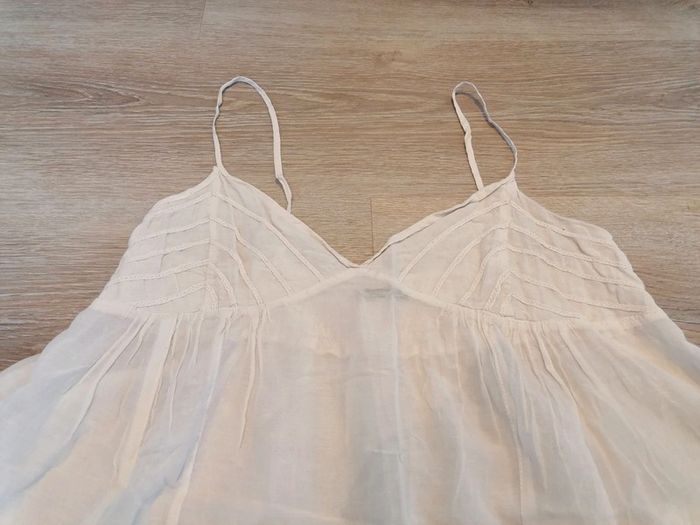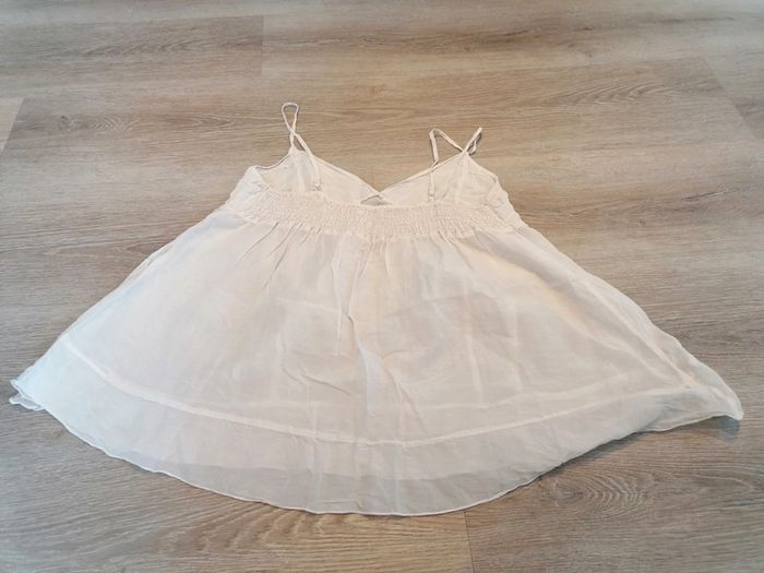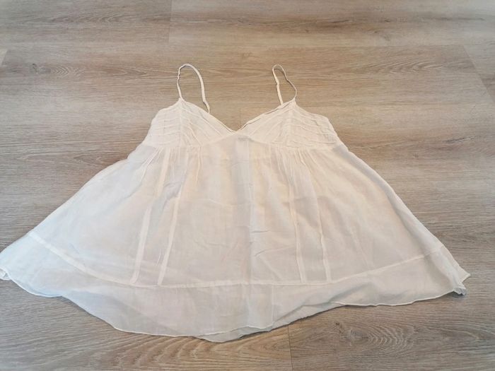 Bonjour, je vends ce débardeur voilage crème de la marque sud express. Poitrine extensible et taille évasée. En bon état. Lavé maison non fumeur.