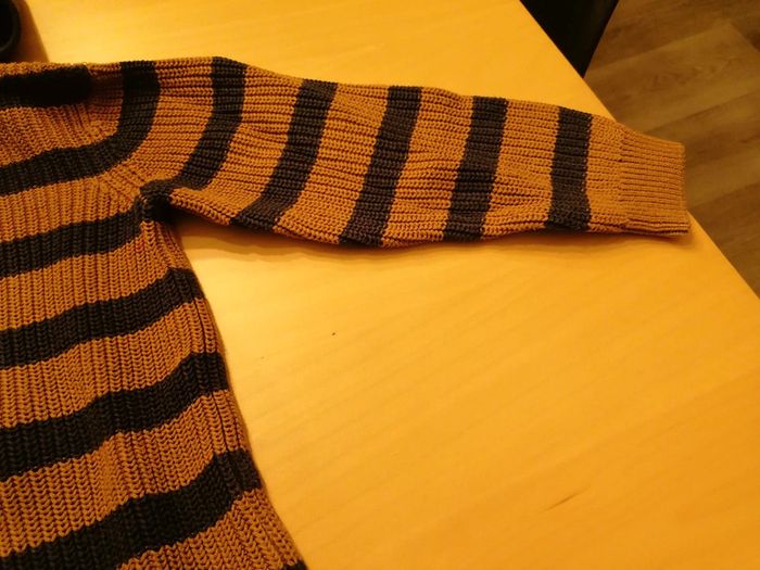 Bonjour, je vends ce pull rayé moutarde et bleu marine à capuche de la marque Gémo taille 8ans en très bon état. Lavé maison non fumeur.