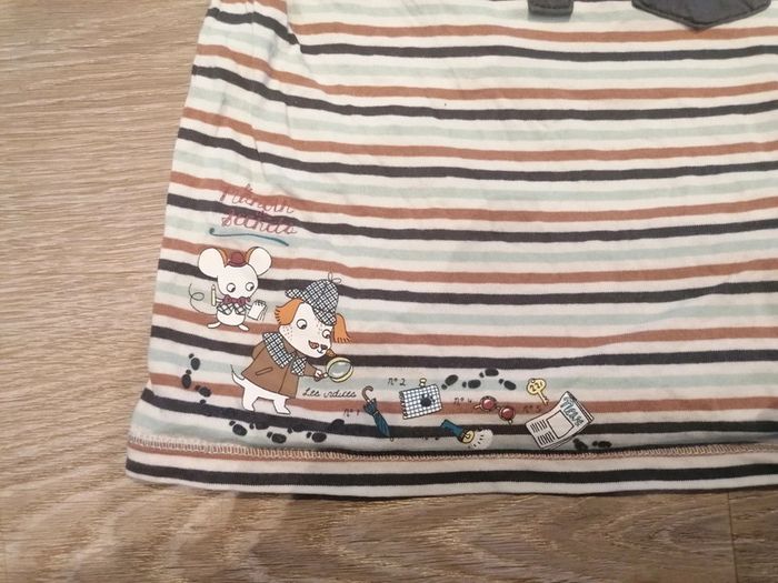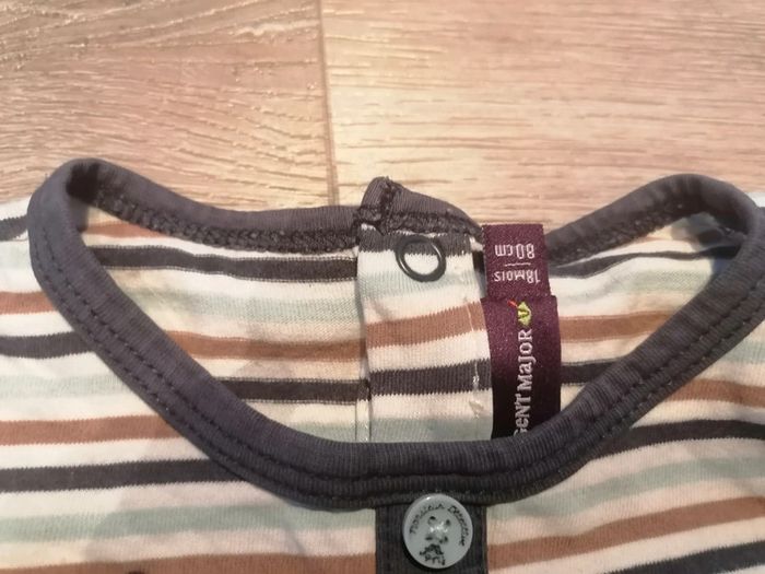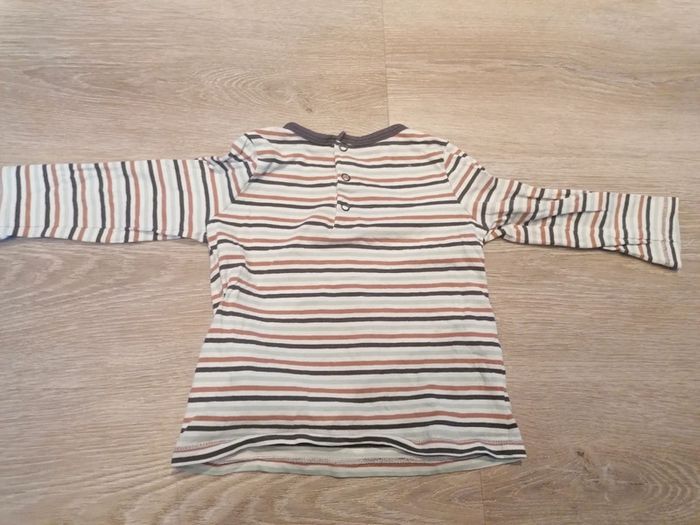 Bonjour, je vends ce tee shirt à manches longues rayé blanc bleu et marron de la marque Sergent major taille 18mois. Lavé maison non fumeur.