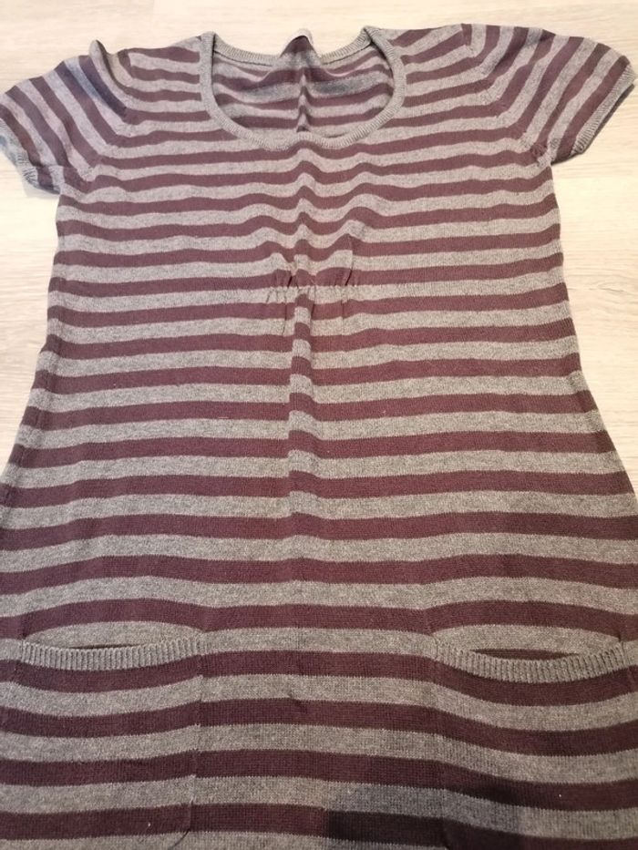 Bonjour, je vends cette robe pull à manches courtes grise et violette de la marque 3 Suisses en très bon état taille 38/40. Lavé maison non fumeur.
