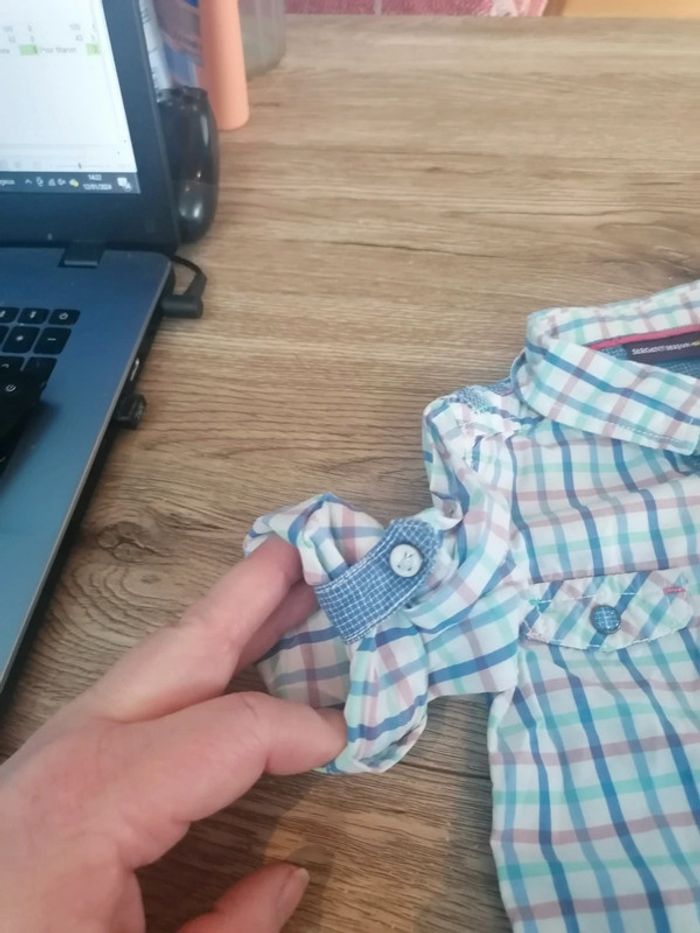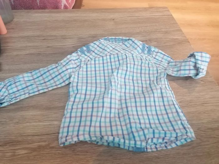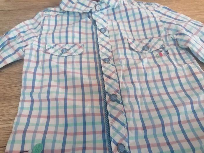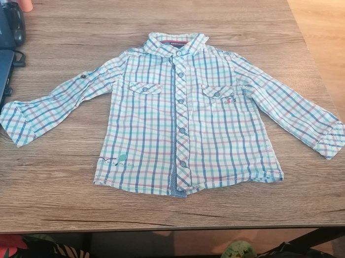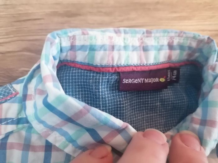 Bonjour, je vends cette chemise a carreaux blanche, bleue et rose de la marque sergent major taille 12mois en très bon état, possibilité de manches retroussables. Lavé maison non fumeur.
