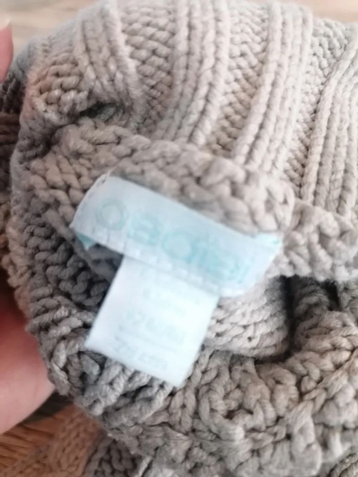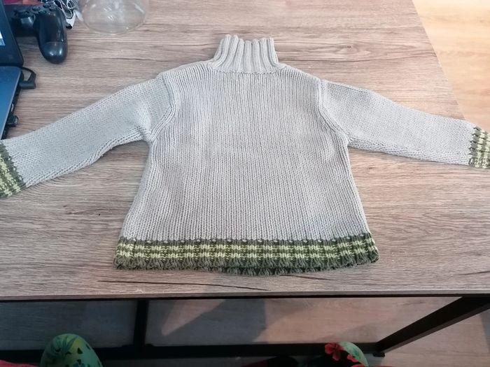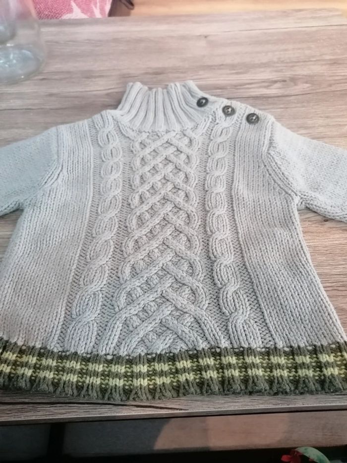 Bonjour, je vends ce pull col montant beige avec le bout des manches et du buste rayé vert clair/foncé. Taille 12mois. En très bon état. Lavé maison non fumeur.