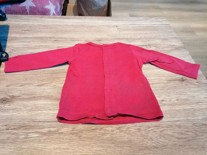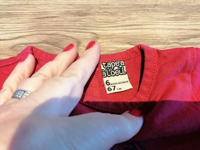 Bonjour, je vends ce tee shirt à manches longues rouge de la marque Tape a l'œil taille 6mois en très bon état. Lavé maison non fumeur.
