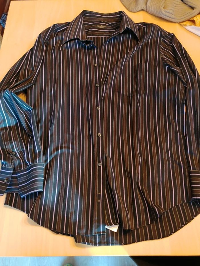 Bonjour, je vends cette chemise à manches longues rayée gris, rose, bordeaux. Très bon état. Taille 44.