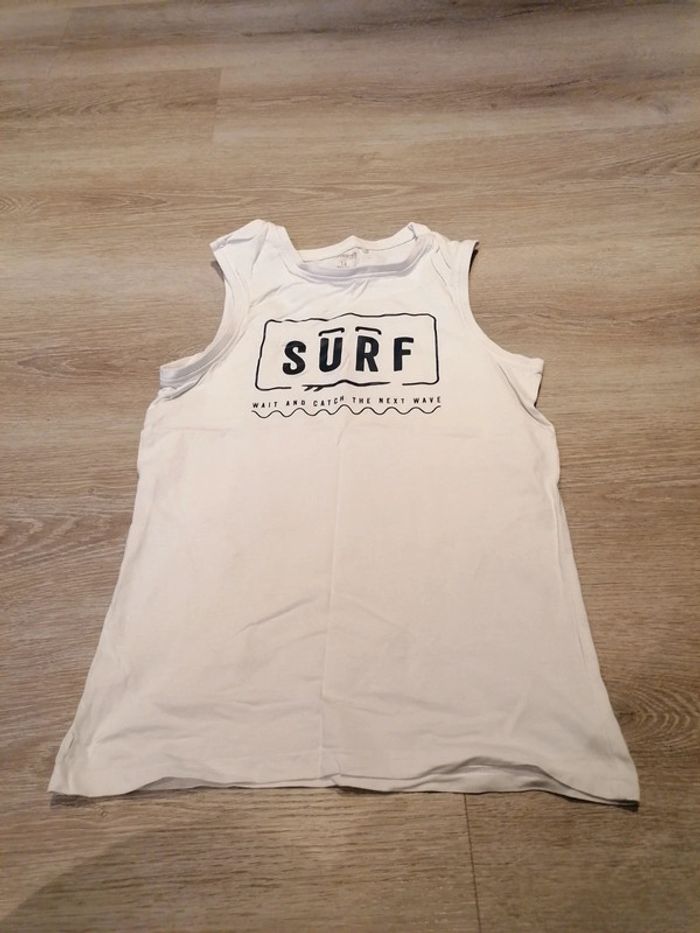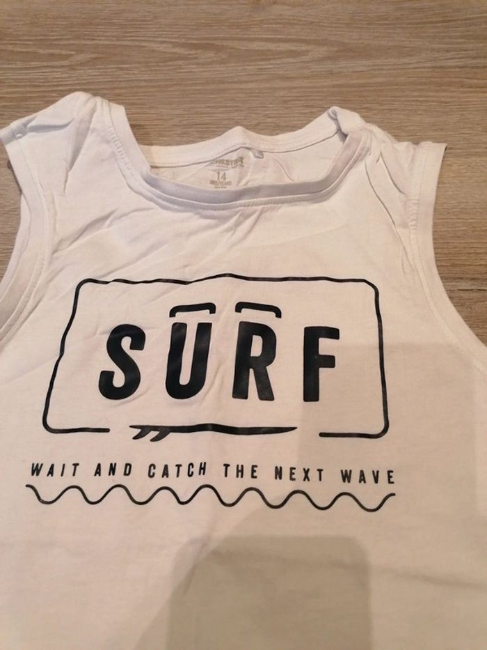 Bonjour, je vends ce débardeur blanc motifs Surf de la marque Orchestra taille 14ans en très bon état. Lavé maison non fumeur.