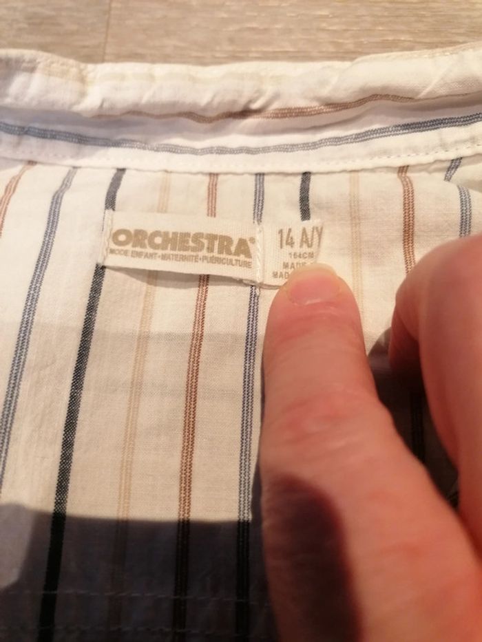 Bonjour, je vends cette chemise à manches courtes rayée de la marque Orchestra taille 14ans en très bon état. Lavé maison non fumeur.
